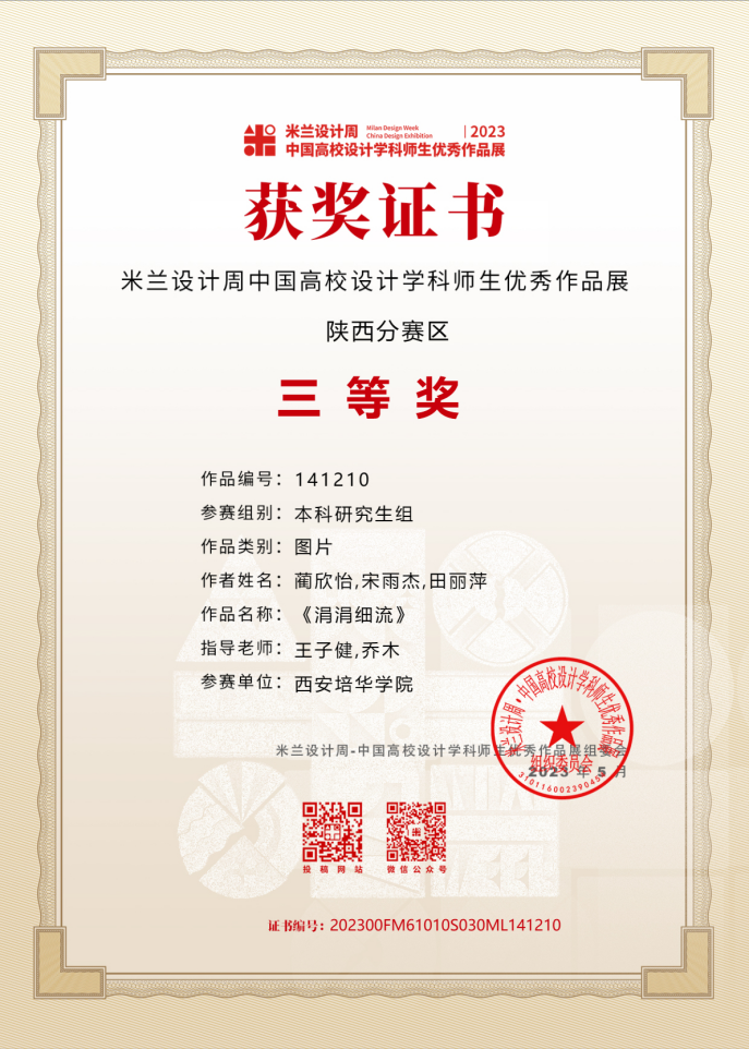 我院推荐参加米兰设计周竞赛指导教师人数共14人,参赛项目共21个作品,共获奖5个作品,其中二等奖2项,分别为李媛老师指导的闫欣彤和雷洁指导的杨希孟。三等奖3项,分别为牛菲老师指导的高帅、杨柳和沈亚丽共同指导的王燕玲、于嘉妮和李灵妍、王子健和乔木共同指导的蔺欣怡、宋雨杰和田丽萍。