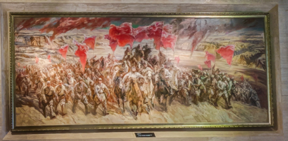 二楼专题展区外部长廊的一侧墙壁上,陈列着由西安美术学院完成的革命题材油画作品。主题油画映初心,“照金精神”在传承。在纪念馆内,十五幅巨幅油画作品用厚重的笔触和浓重的色彩,描述出以照金为中心的陕甘边革命根据地所发生的重大革命事件,用艺术的手法呈现了历史场景,将老一辈无产阶级革命家坚韧不拔的信念和为真理献身的决心跃然纸上。
