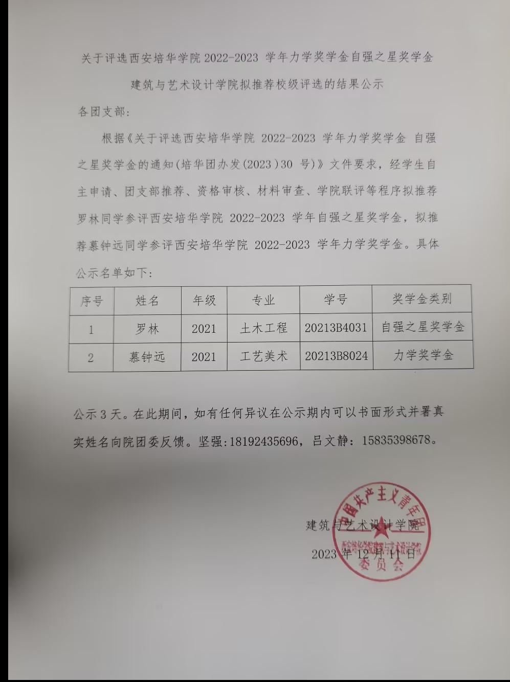 经评议,我院2022-2023学年力学奖学金、自强之星奖学金拟推荐校级评选结果公示如下: