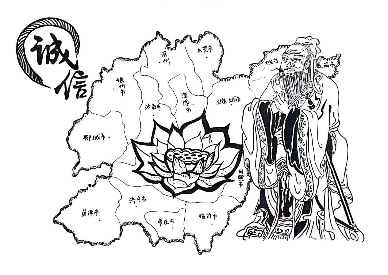 作品以孔子、莲花及地图为主题,配以小字装饰,让整个作品更加和谐。莲花寓意高贵圣洁,处于作品的正中间,更加突出作为当代大学生的我们要洁身自好,诚实守信。作品的另一个主体是孔子,孔子作为儒家学派的创始人,在山东有着重要的影响力。孔子说:"人而无信,不知其可也”。可见诚信的重要性。