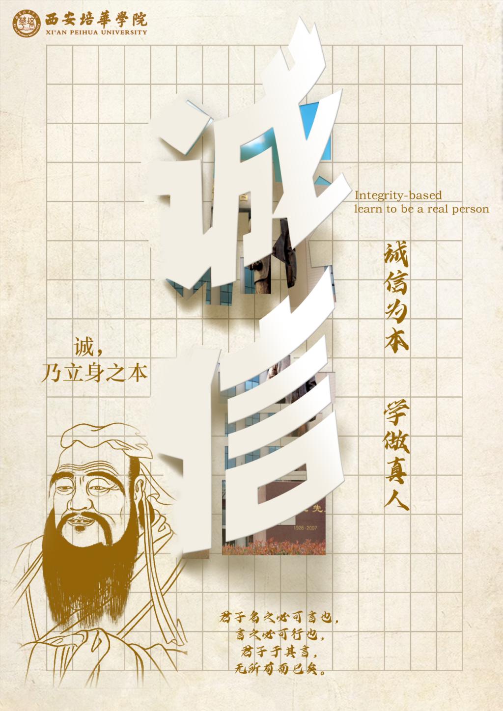 该作品以孔子画像和孔子对于诚信的名言为主导,目的是体现出希望培华的青年学子能够“以诚信为本”,营造浓厚的育人氛围和培华校园书香氛围。发扬广大学子对待诚信的道德准则,提倡孔子的处世治学原则。