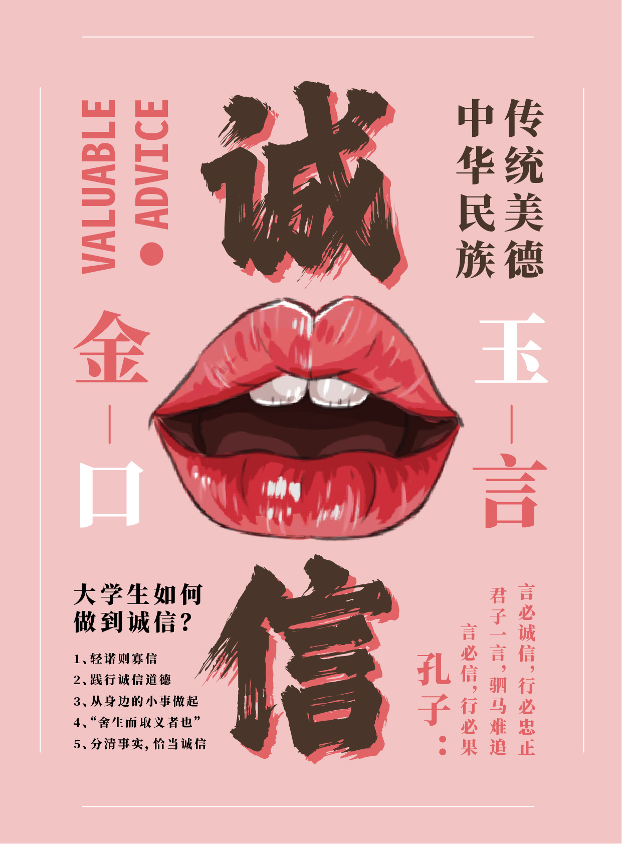 诚信是我们中华民族的优秀传统美德。该作品以诚信相关成语“金口玉言”展开绘画并进行排版,用书法体作为标题,利用竖排版体现传统特色和张力,用手绘的嘴唇漫画和较为活泼清新的色调突出作为当代大学生的诚信观念。