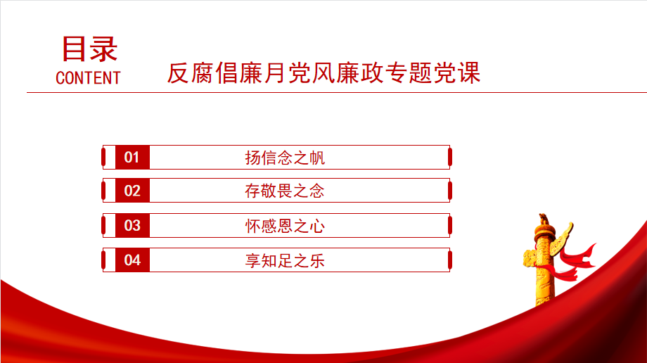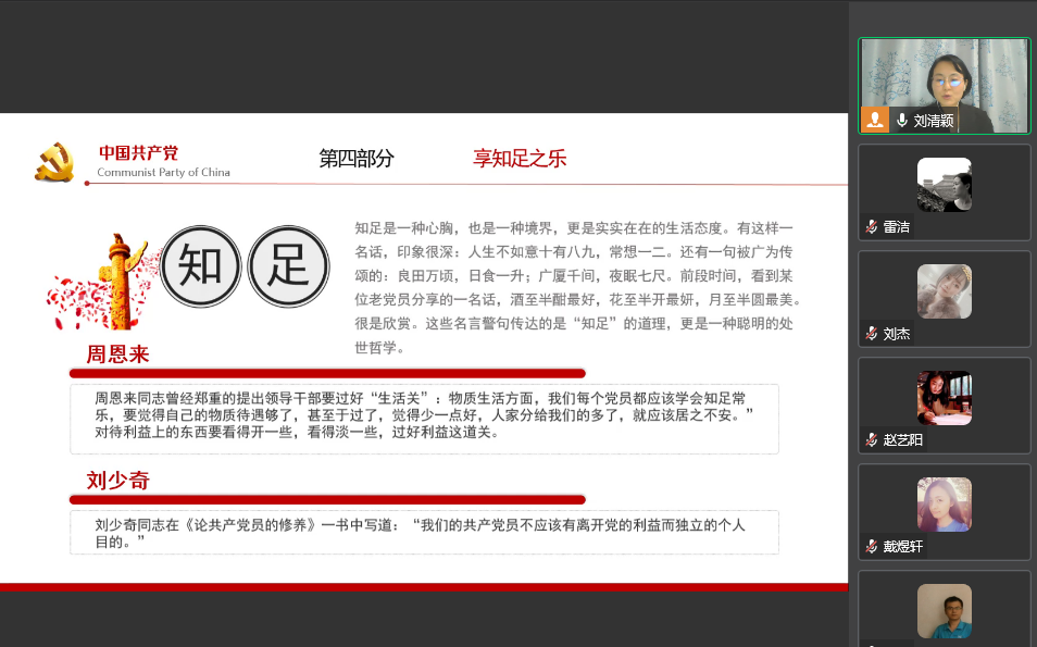 党课从扬信念之帆、存敬畏之念、怀感恩之心、享知足之乐四个主题进行了深刻细致的讲解。以“六尺巷”、“不贪为宝”、“毛泽东的廉洁故事”几个小故事出发,指出共产主义是一种信仰,党员权利是人民赋予的,党员同志要敬畏权利、敬畏党组织、敬畏党纪国法。党员同志更应该常怀感恩之心,感恩组织、感恩家庭。共产党员的修养,不是“得”和“失”的概念,是否真正服务了人民才是共产党员的标志和试金石。
