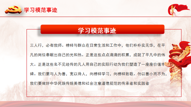 赵老师讲到,榜样在日常生活和工作中的意义,他们朴朴实无华,在平凡的岗位奉献出自己的光和热。正是这些点点滴滴的积累,成就了平凡中的伟大。正是这些名不见经传的普通人用自己的实际行动为我们塑造了一座座价值丰碑。我们要与人为善,宽以待人,向榜样学习,向榜样致敬。勿以善小而不为,我们要做中华民族传统美德和社会主义道德规范的传承者和实践者。在宣誓入党的那一刻,我们就该警醒自己,在行动上,我们要以严要求,高标准来衡量自己,以身作则,不计较个人得失。大事讲原则,小事讲风格,取长补短。作为毕业年级的同志们,即将开启人生新的征程,更应该严格要求自身行为,端正自己的思想,时常学习先进典型,汲取榜样力量。
