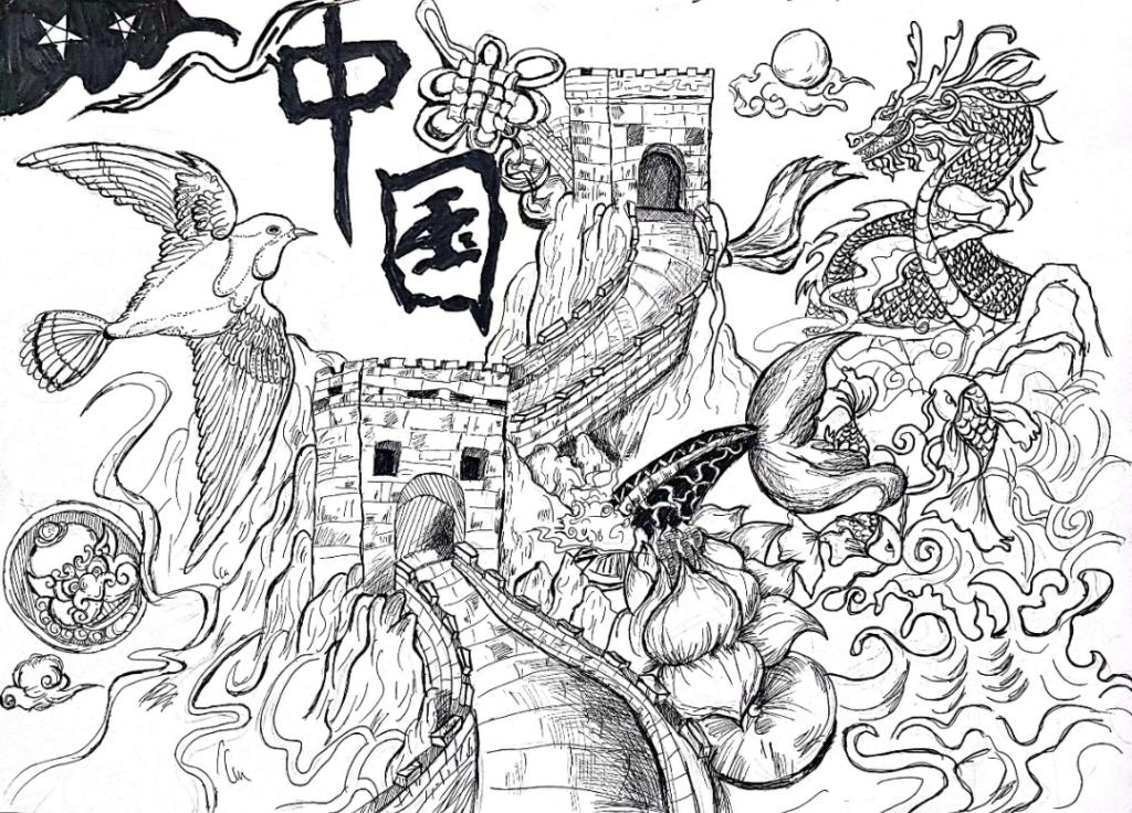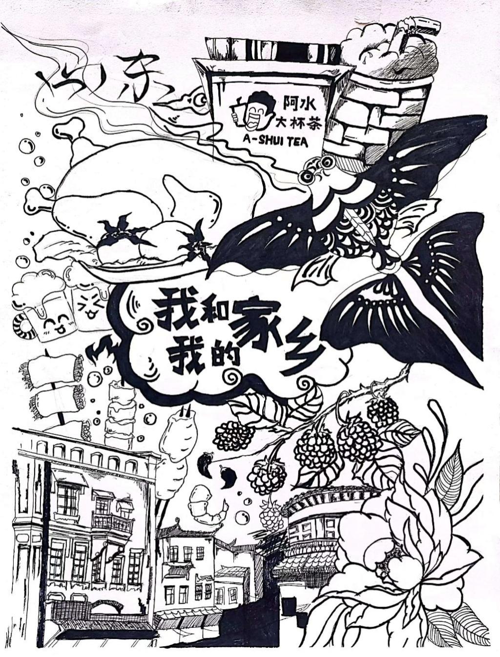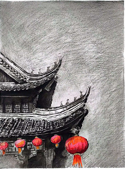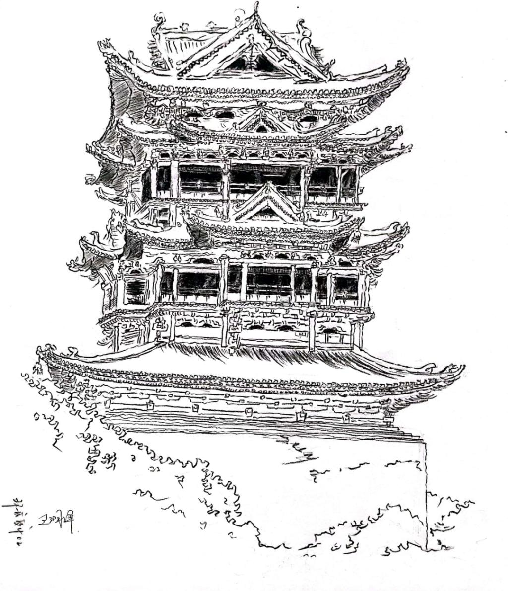 我的家乡潍坊,南邻沂蒙山,北靠渤海湾,钟灵毓秀,万紫千红。想必大家对潍坊的了解一定是从风筝之都这个美称而来的,在潍坊的广场上,五彩缤纷的风筝飞舞在湛蓝的天空,成千上万条丝线承载着五湖四海的热情,渲染出潍坊的勃勃生机。我所绘画的是潍坊的奎文门,它是潍坊明代建筑,是潍县东关城门之一。现存的奎文门是1988年修复的,奎文门三层上书鸢飞鱼跃四字,下有奎文门三字,隔河与文昌阁相望,遂命为奎文门以振文风。