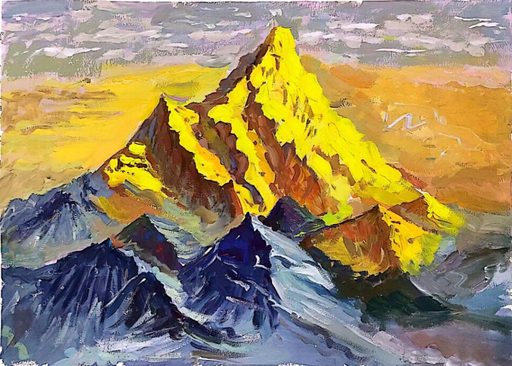 岱宗夫如何,齐鲁青未了。我所描绘的正是五岳之首-泰山,孔子曾叹“登山而小天下”这正反应出,有了中国共产党的领导中国才有了今天的高度,山东省是泰山的所在地,也是重要的抗日革命根据地。围绕“以我之笔,绘家乡之美”的主题,描绘了此画,同时也庆祝党的二十大的胜利召开,此画的黄色和蓝色,象征着我国复兴之路的光辉历程和风险曲折阳光察透云层,照在山顶。俯视而下,正是一抹又一抹的红色从八方登顶,我想中华人民具备着极其优越的泰山精神-“以我为傲”“迎难直上”,才奋斗出了今天的一切!新中国的发展正如这“日照金山”璀璨而又辉煌!
