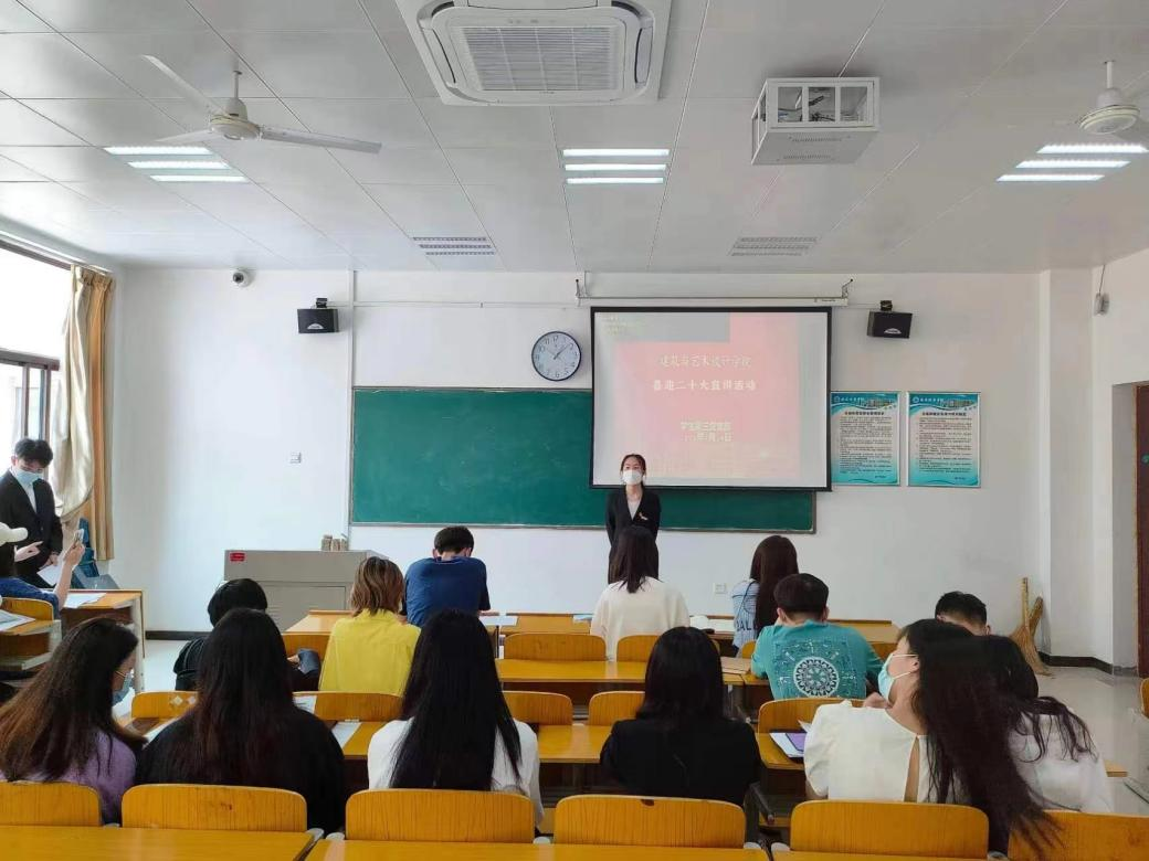 今年是中国共产主义青年团成立100年,是党的二十大召开之年。为激励我院广大学生攻坚克难、开拓奋进,紧紧围绕喜迎党的二十大,深入学习习近平总书记带领全党全国各族人民在实现中华民族伟大复兴新征程上走过的非凡十年,广泛宣传党和人民创造的新作为新业绩,建筑与艺术设计学院党委开展“喜迎二十大--强国有我,请党放心”主题宣讲活动。