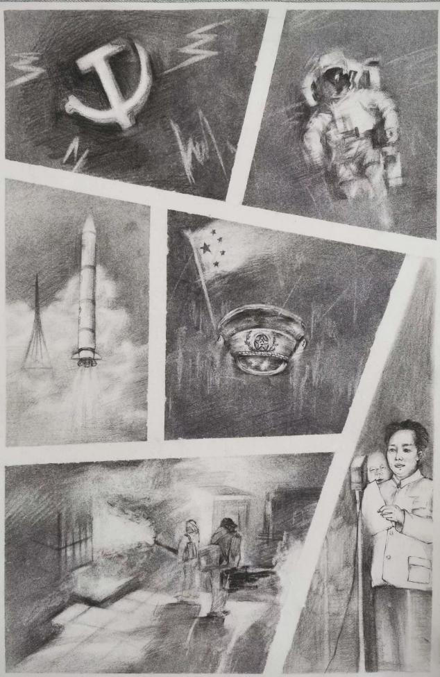 作品介绍:这副画,采用了分镜的方式进行创作。采用“党徽”,“国旗”,“宇航员”,“火箭” ,“医护人员”等元素。这些不同的板块,则代表着我们多年来的足迹与成就,以及永远跟党走这一亘古不变的信仰、决心。不管前方的道路多荆棘,中国共产党都会带着我们披荆斩棘。