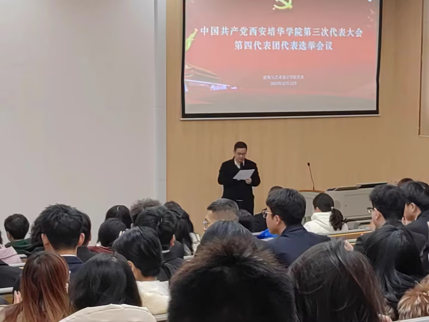 为高举中国特色社会主义伟大旗帜,以习近平新时代中国特色社会主义思想为指导,全面贯彻落实党的二十大精神,按照校党委《关于认真做好中国共产党西安培华学院第三次代表大会代表推荐选举工作的通知》的要求,我院党委于2023年12月12日中午在3505召开党员大会,进行中国共产党西安培华学院第三次代表大会第四代表团代表选举。