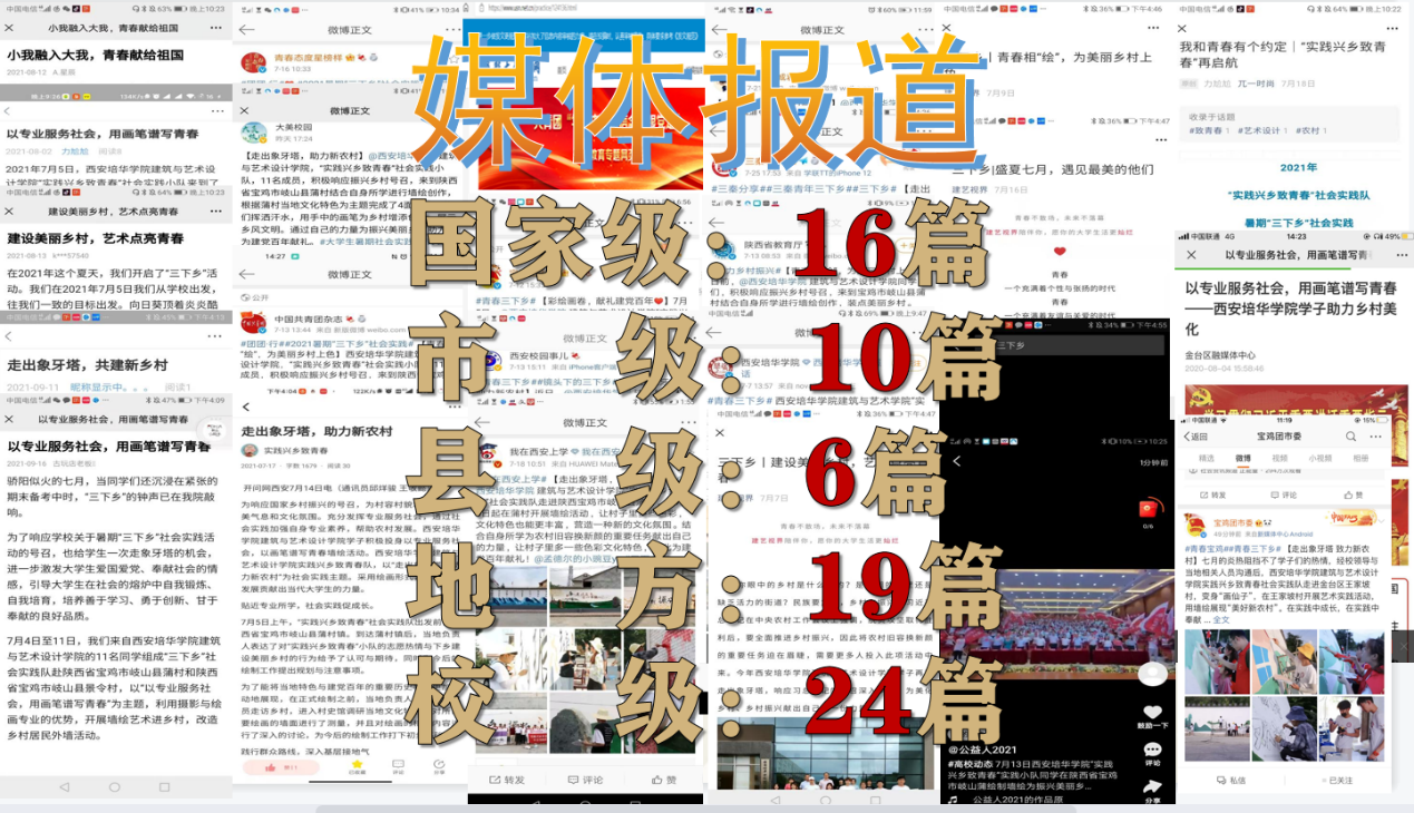 团支部以志愿服务活动为载体,引导支部成员不惧风雨,勇挑重担,让青春在党和人民最需要的地方绽放绚丽之花。积极引导支部成员参与社会实践活动。我班班长马力带领本班学生连续两年“三下乡”出征,助力乡村振兴,绘画共计1000余平方米,荣获西安培华学院优秀标兵团队。“三下乡”队伍的正能量事迹受到多个媒体报道,其中媒体报道国家级:16篇、市级:10篇、县级:6篇、地方:19篇、校级:24篇。