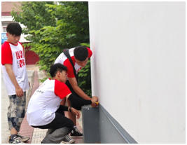为了能将当地特色与建党百年的重要历史事件更加生动地展现,在正式绘制之前,当地负责人带我们走访乡村,对所需要绘画的墙面进行了测量,并且对绘画的相关内容进行了深入的讨论,为今后的绘制工作打下初步基础。