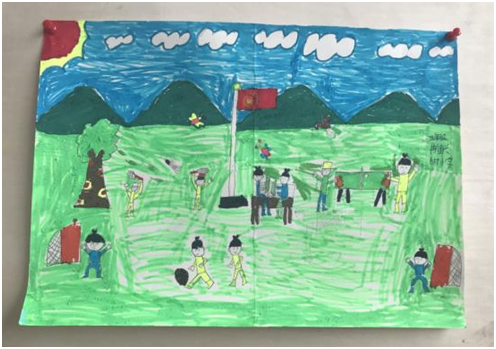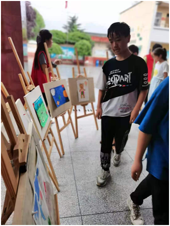 展会分为室外绘画作品展以及室内扎染模型展,绘画作品来自于乔村小学各年级学生,内容由孩子们自主设计,稚嫩的画作展现着孩子们的认真与重视,吸引了在场很多人的目光,服装扎染和模型分别由五六年级学生、一二年级学生在志愿者的帮助下创作完成。每个作品都是独一无二无可替代的。