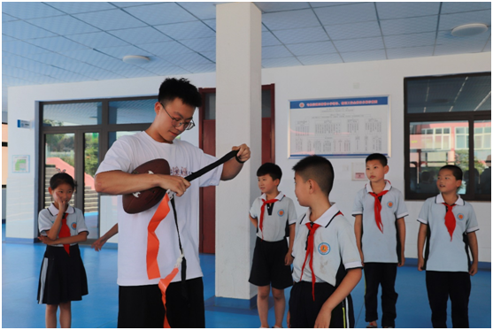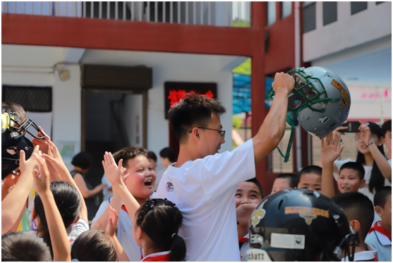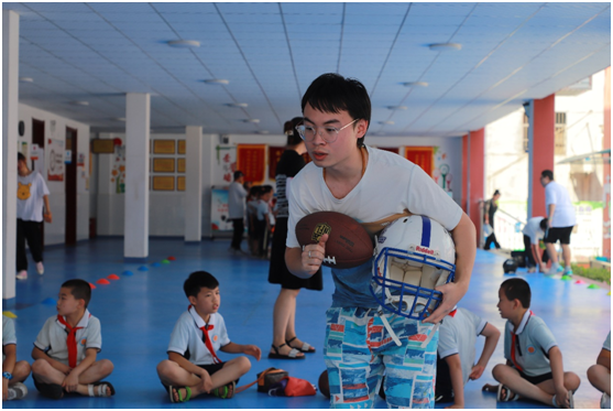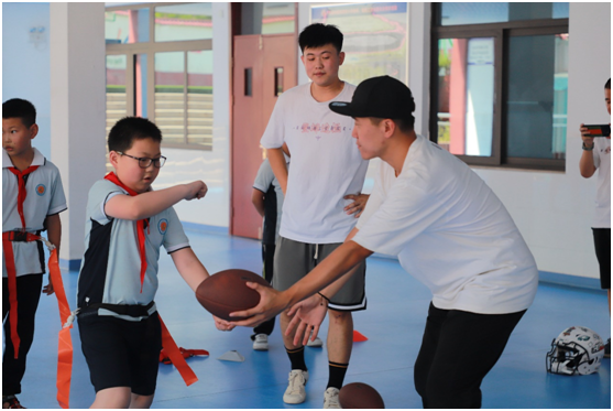 工程造价1803班学生陈郁晓为孩子们讲解橄榄球规则