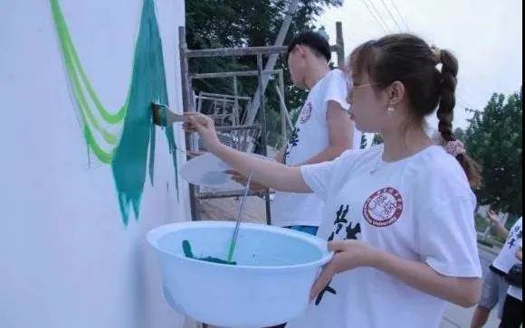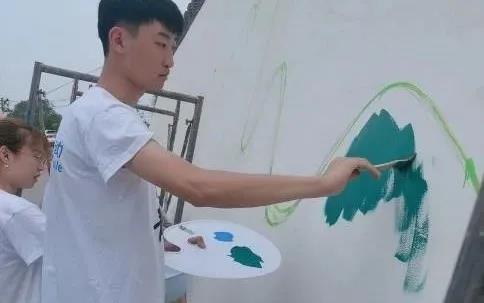 7月29日早晨,实践兴乡致青春社会实践队全体成员迎着尚未飘散的晨雾,测量、分块、定点、起形、描线、调色、填色,有条不紊的将设计图纸一步步变成墙绘。