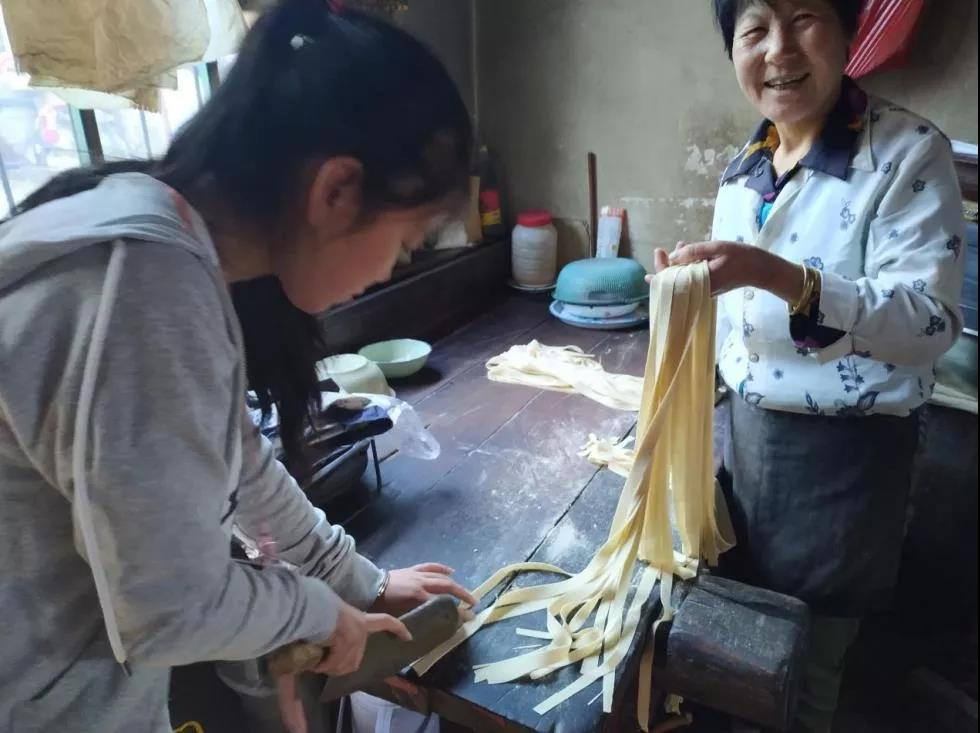 在我们离开这里的前一天,我们阳光志愿实践队决定和乡亲们一起做一顿可口的饭菜,感谢乡亲们的积极配合和热情招待。我们将和好的面放在老式的手摇压面机进行干压,学习如何使用灶台生火,在乡亲们的指导下做臊子面。几番折腾下一顿可口的臊子面就做好了,大家纷纷拿起碗筷开动,脸上洋溢着笑容。