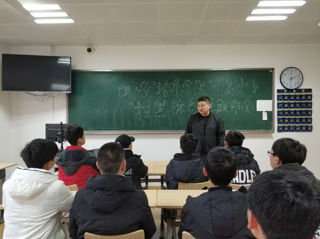 辅导员蔡国强老师召开扫黑除恶主题班会。在班会上,老师向学生们讲述了相关法律知识,并通过各种案例向学生展示黑恶势力对于社会的危害。同学们会后纷纷表示,要坚决拿起法律武器,与黑恶势力作斗争。
