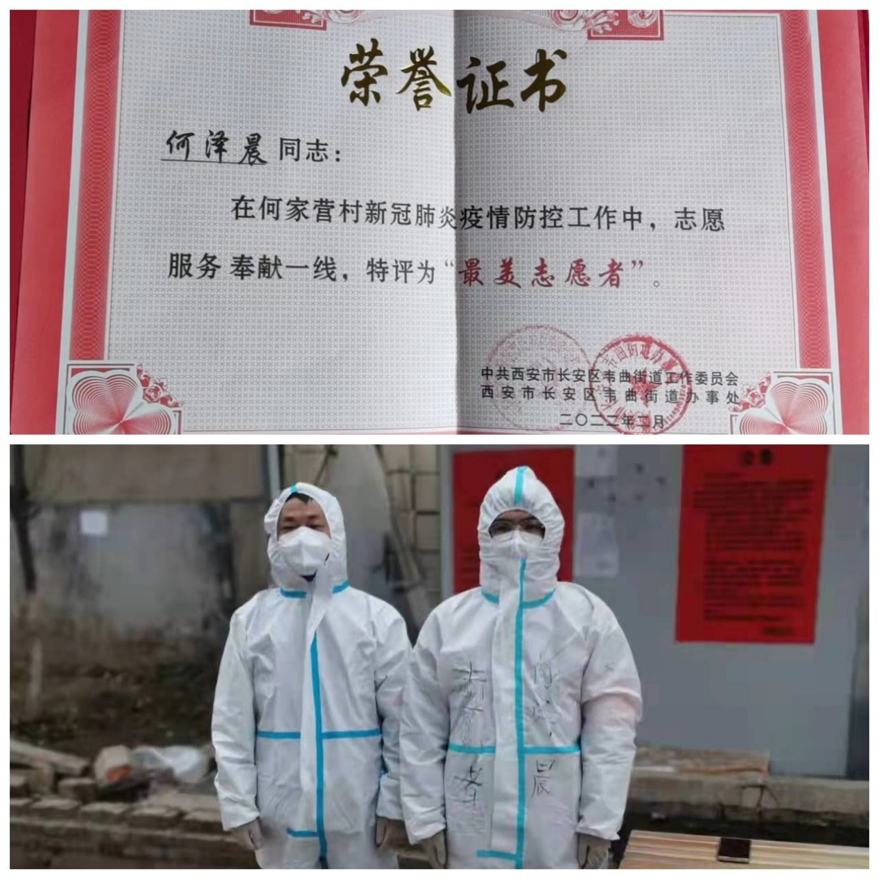 我校团学青年积极响应学校号召来到社区参加防疫工作,我校分团委书记何泽晨在西安市长安区韦曲街道何家营村参加志愿工作,因为工作期间表现优秀受到了当地街道办事处的一致好评,体现了雷锋志愿服务精神。