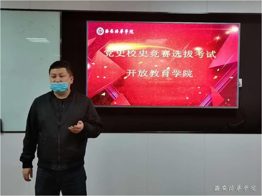 为深入贯彻习近平新时代中国特色社会主义思想,在全校掀起学习“四史”及校史的热潮,激发广大学生的爱党爱校热情,根据《中共西安培华学院委员会关于开展第二届“不忘初心 牢记使命”党史校史知识竞赛活动的通知》文件要求,开放教育学院于2020年10月26日在格物楼2309教室开展党史校史选拔赛。