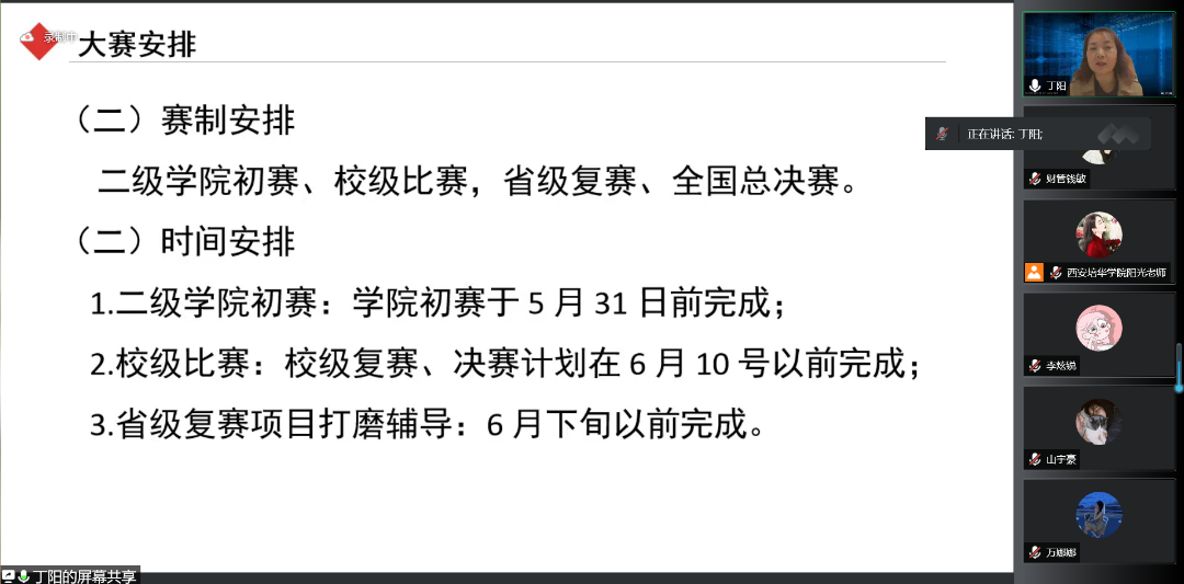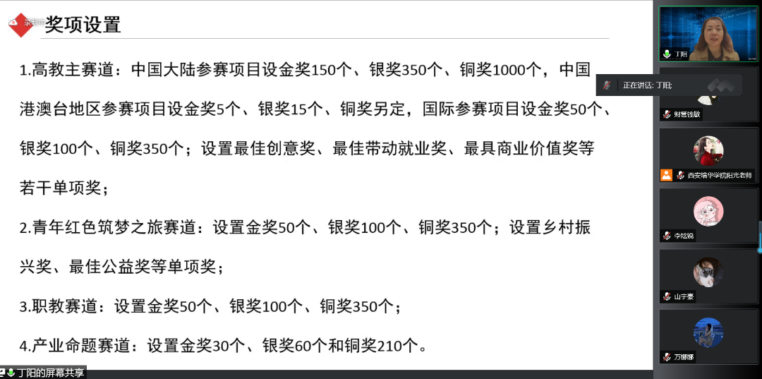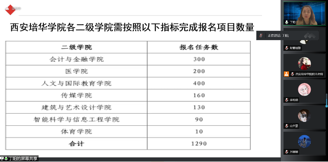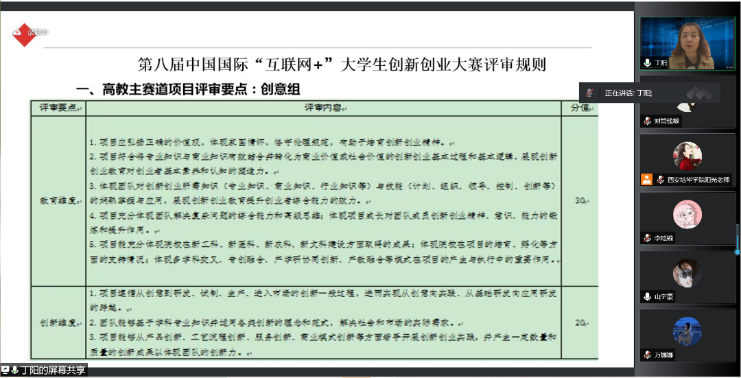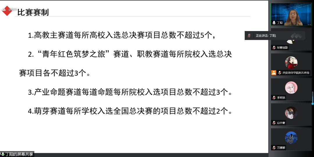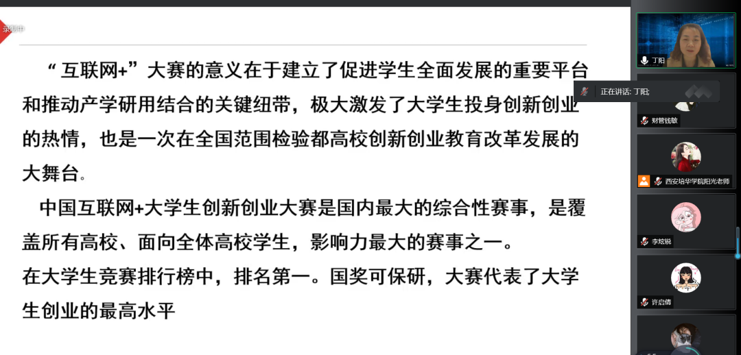 为了鼓励更多学生参与“互联网+”大赛,为已经参加“互联网+”大赛的同学提供建议与指导,提高西安培华学院会计与金融学院人才培养能力,培养一大批有理想有能力的学生,促进我院学生创新创业。西安培华学院会计与金融学院创新创业教研室于2022年5月13日14:15开展了以“互联网+大赛那些事”为题的线上会议。会议的主讲人是丁阳副教授,与会人员有江凤香老师以及会计与金融学院部分学生。