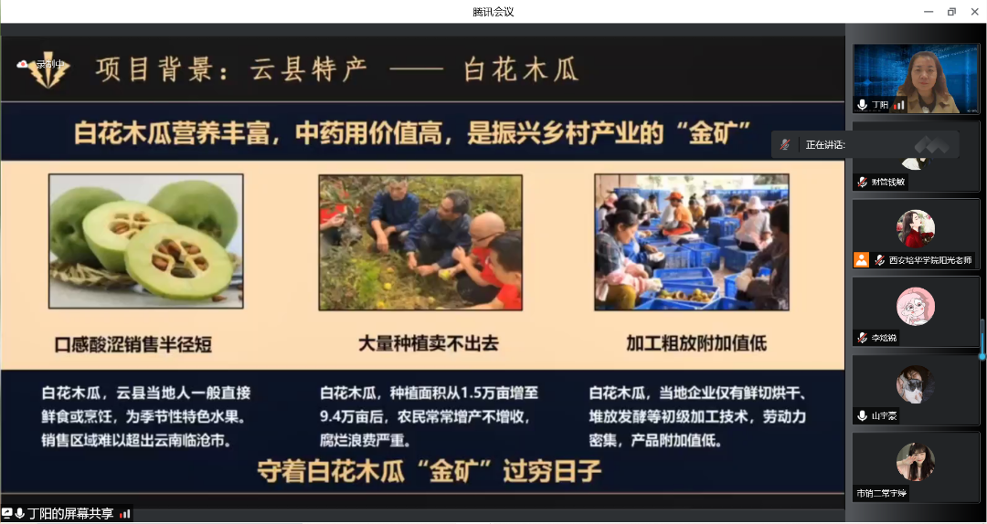 最后丁阳副教授展示了“聚果盆”具体案例,点出了该案例“三个一”的模式,以及赞赏了该案例将核心业务内容做了讲解,还播放了湘西民遗线上会展平台视频,让参赛学生有借鉴模式,欣赏优秀的创新意识,学习创业模式。