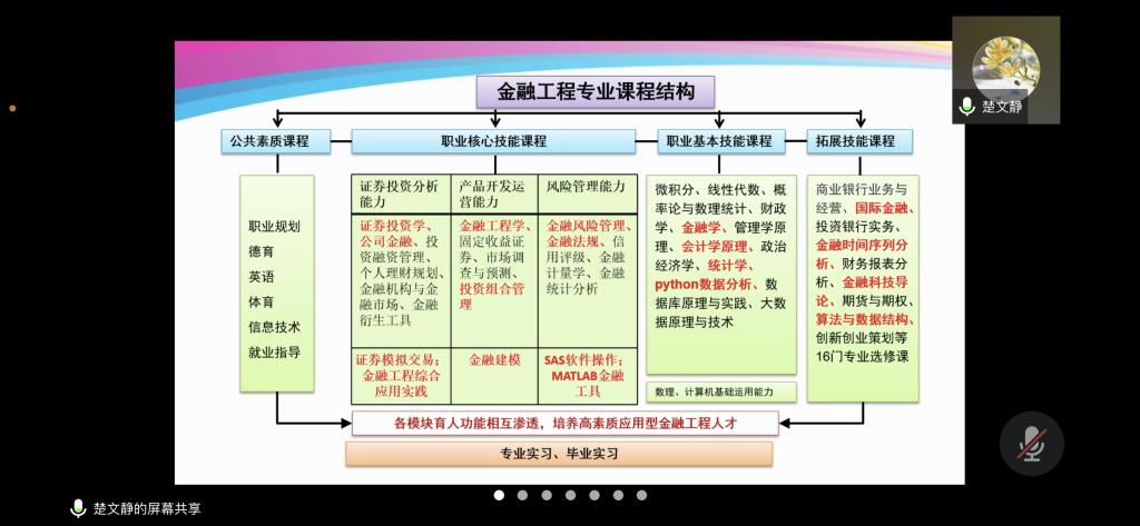 在初赛中,因为本次参赛规则要求在该比赛中曾获得二等奖及以上的专业无参赛资格,因此本次课程体系的比赛只有楚文静老师团队的金融工程专业参赛。楚老师依托与人才培养方案,细致剖析金融工程专业课程结构,产教融合,校企互动,将各模块育人功能相互渗透。