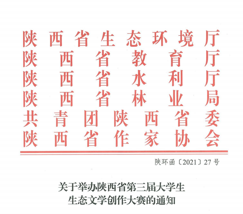 为深入践行习近平生态文明思想,贯彻党的十九届五中全会和中共中央、国务院《关于加快推进生态文明建设的意见》精神,隆重庆祝中国共产党成立100周年,牢固树立“绿水青山就是金山银山”理念,充分展示“十三五”以来我省生态文明建设和生态环境保护方面取得的成就,反映新时期大学生丰富多彩的生活,激发大学生创作热情,带动在校大学生关注、参与生态环境保护,提高生态文明素养,提升生态环境意识,迎接和助力第十四届全国运动会,省生态环境厅、省教育厅、省水利厅、省林业局、团省委和省作家协会决定联合举办陕西省第三届大学生生态文学创作大赛。