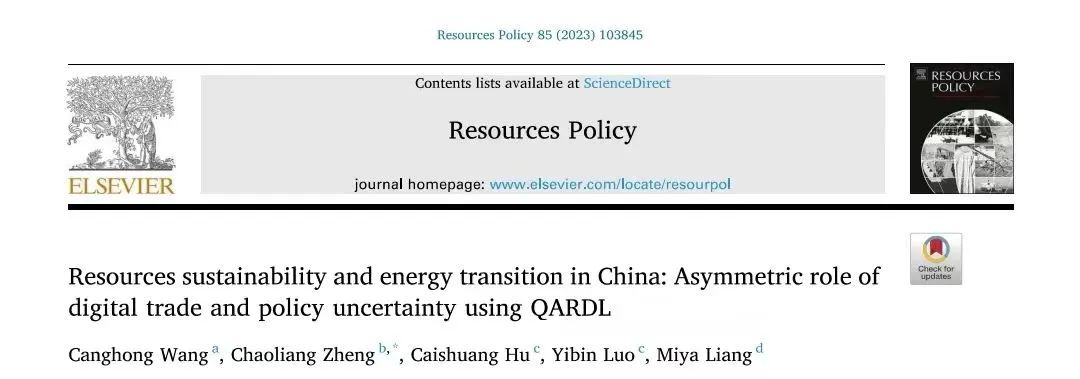 近日,会计与金融学院王仓红博士作为第一作者,西安培华学院学院会计与金融学院作为第一署名单位的研究成果《中国资源可持续性和能源变迁:利用分位数自回归滞后模型分析数字贸易和政策的非对称性作用》,在SSCI收录期刊《Resources Policy》发表,该期刊创办于1974年,致力于研究资源的开采、生产和利用中的经济与政策问题,是一本被Web of Science收录的国际知名期刊,位列JCR分区Q1,中科院分区一区Top刊,2023年影响因子10.20。