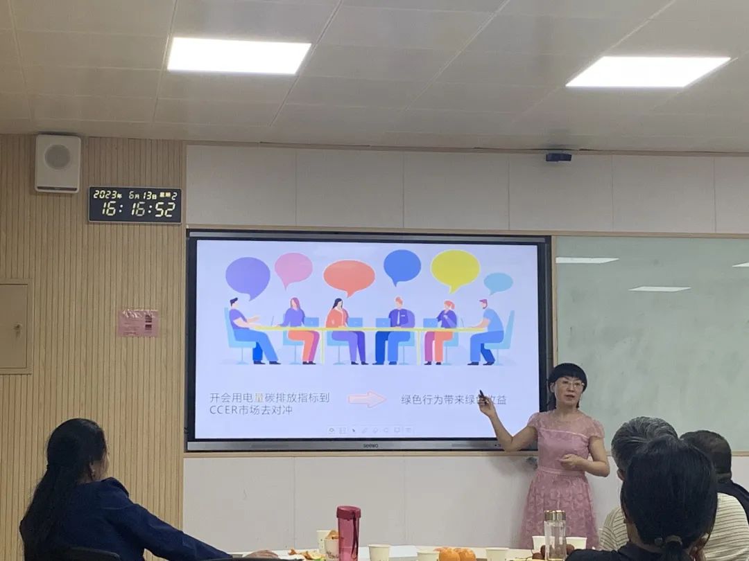 会计学系碳会计研究团队负责人张蓉教授以“碳会计与我”为切入点,分享了碳会计领域的最新研究成果,从会计视角积极思考双碳背景下碳会计体系,研究碳会计核算涉及主要内容、碳排放权交易会计发展。同时,她也倡导教师们在教育教学中融入绿色低碳环保理念,将绿色要素、绿色理念融入课堂教学全要素、全过程。