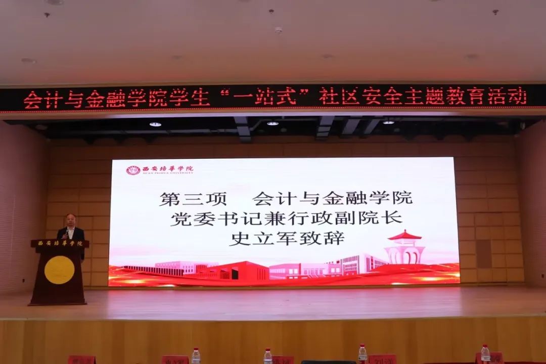 参加本次活动嘉宾有:西安市公安局长安分局常宁派出所警官刘洋;西安市公安局长安分局常宁派出所警官雷嘉豪;党委学工部副部长、学生服务中心副主任姚斌;会计与金融学院党委书记兼行政副院长史立军;会计与金融学院党委副书记刘斌;学生服务中心社区主管樊海英、学生服务中心社区管理干事罗兰;后勤服务中心鼎盛物业公寓负责人庞磊;以及会计与金融学院辅导员、社区公寓管理员、楼层长及宿舍长学生代表,共计400余人。本次会议由会计与金融学院党委副书记刘斌主持。