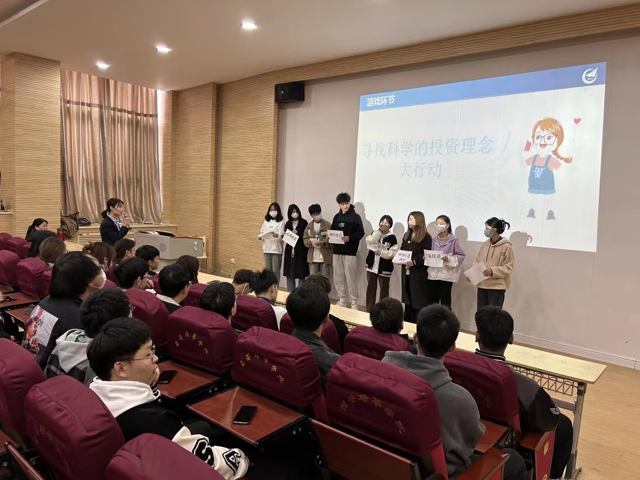 讲座共分为三个环节,第一环节为寻找科学投资理念大行动,现场随机选取8位同学参加游戏,寻找到积极科学投资理念的同学获得现场礼品一份,游戏环节气氛活跃,同学们积极踊跃参与,会场气氛非常活泼。