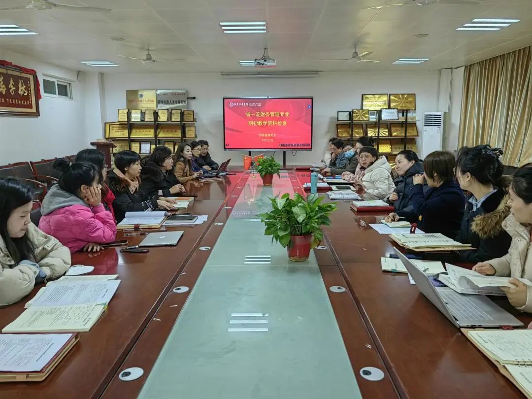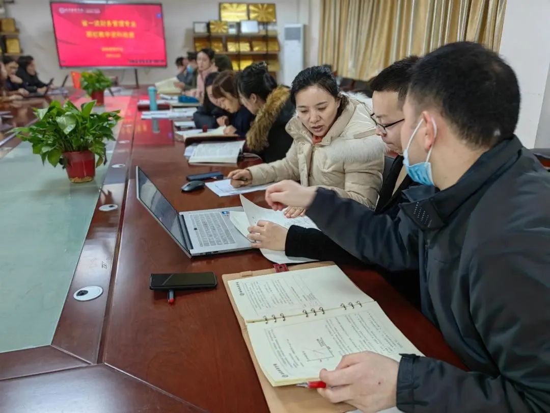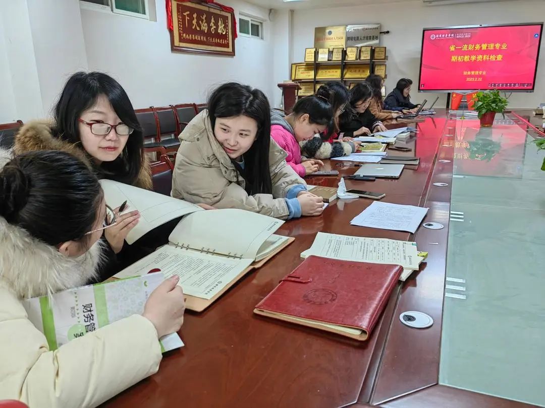 为进一步加强日常教学管理,规范教学行为,保证稳定的教学秩序,根据会计与金融学院期初教学检查汇总建议:“教师的教学资料,事关其教学效果和学生反馈,教师应进一步修改完善教案与开课说明,每章加入思政点和二十大相关内容,教材、教案、开课说明要三者统一”的思想,2023年2月22日,管理系系主任李永红带领全体教师在2115会议室完成省一流财务管理专业期初教学资料检查工作。