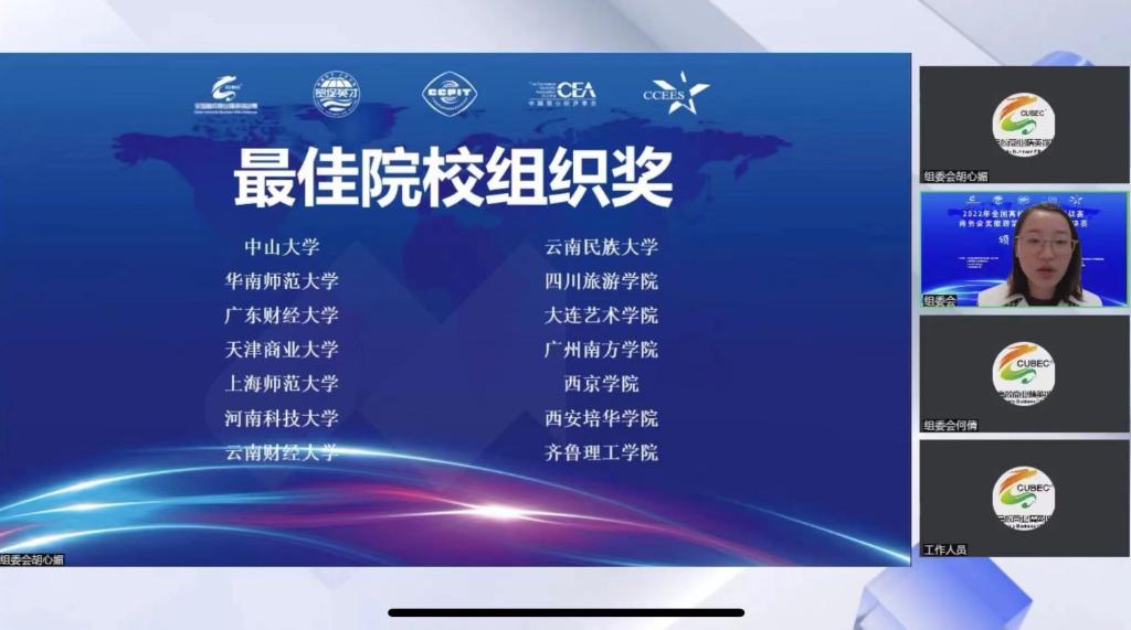 2022年11月18-20日,由中国国际贸易促进委员会商业行业分会、中国国际商会商业行业商会、中国会展经济研究会和中国商业经济学会共同主办的2022年全国高校商业精英挑战赛商务会奖旅游策划竞赛全国总决赛在腾讯会议平台成功举办。经过初赛激烈角逐,此次总决赛共有来自中山大学、华南师范大学等全国20多个省40余所高校的百余支队伍入围,线上参赛规模800余人,竞争异常激烈。