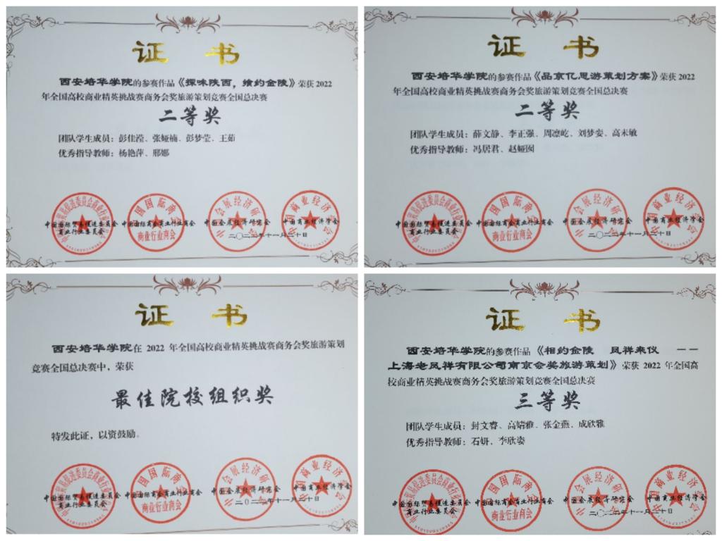 今年是我院参加本赛事的第三年,在学院领导的支持下,专业教师积极指导,学生参赛积极性高涨,经过激烈角逐,有6支队伍进入全国总决赛。为确保作品质量,我院经过层层选拔,最终推荐《探味陕西飨约金陵》、《品京忆思游策划案》和《相约金陵凤祥来仪--上海老凤祥有限公司南京会奖旅游策划》三个项目参加全国总决赛,并斩获优异成绩。