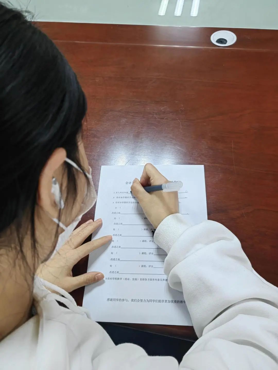此外,本次师生座谈会还增加了一个新的环节,就是学生代表对本学期开设的课程的教学满意度展开调查活动。该项活动通过现场发放调查问卷来完成,主要针对本学期开设的专业课,从课程设置的合理性、学生感兴趣程度、教师的教学水平等方面进行综合打分评价。学生们参与度很高,都认真填写了调查问卷,使得本次座谈会取得了更加切实的成效。