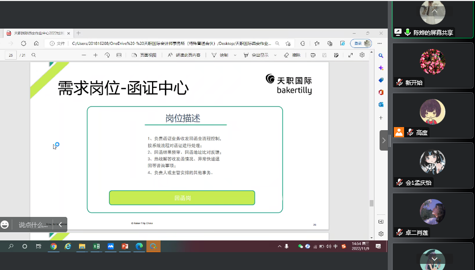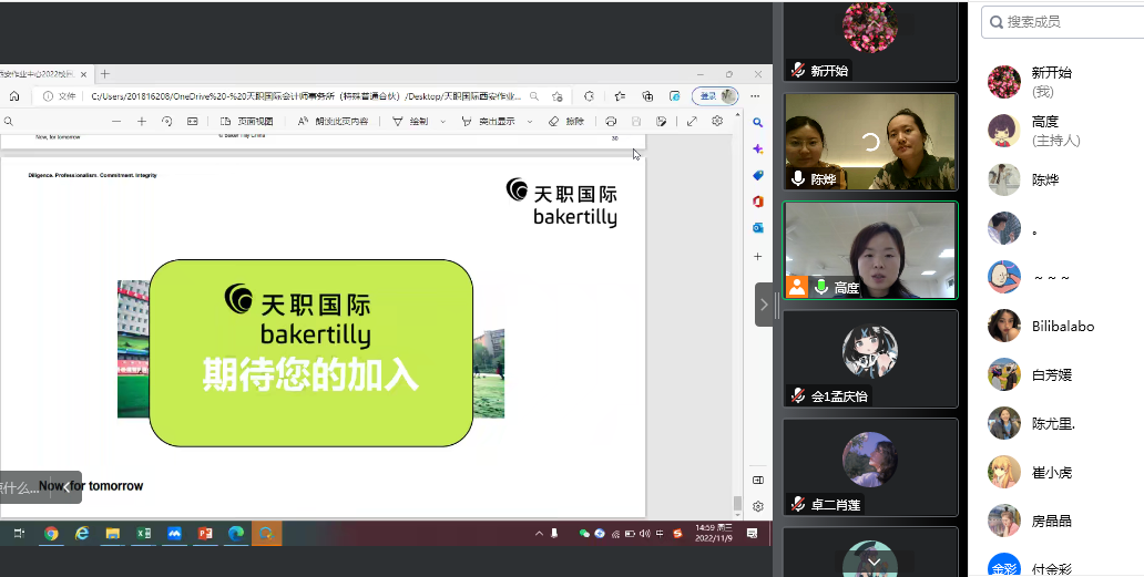 大学生专业实习是学生运用专业知识解决实际问题、理论与实践相结合的重要教学环节,是培养学生分析问题与解决问题能力的重要途径,是会计学专业教学的重要环节,也是提高学生综合素质,培养学生创新意识与实践能力的有效保证。2022年11月9日,会计学系天职国际专业实习线上专场宣讲会召开,会计学系副主任高度与天职国际主讲老师陈烨等,以及会计学系师生共计60余人参加了会议。