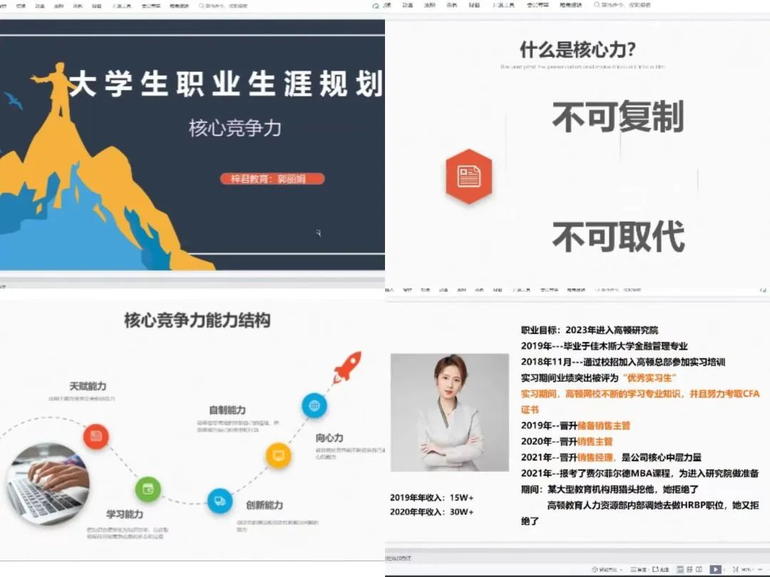 上海梓君教育集团创始人郭丽娟女士为我们分享大学生职业生涯规划——核心竞争力。今年就业形势相对来说更加考验学生的核心竞争力。什么是核心竞争力?核心竞争力有两个条件:不可复制,不可取代。作为大学生,我们最核心的能力即是学习能力,学生更容易接收习得新知识,学生时间相对于职场人来说,更加自由,可以利用时间学习更多内容;另一方面,学生思维不受限,经验主义是双刃剑,经验固然重要,但是同时也容易形成思维固式。用不可取代的学习能力,无限的思维能力,打造不可复制的能力。