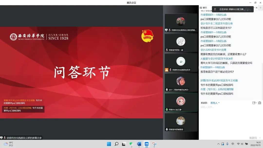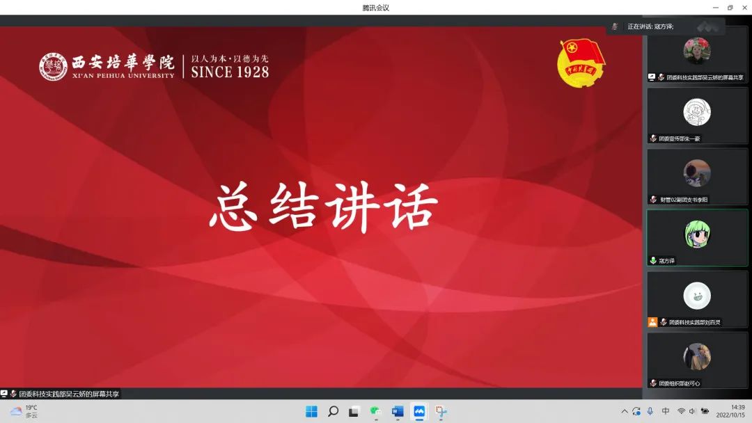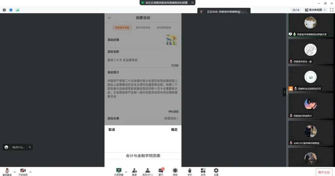二十大来临之际,为协助大一各支部团干快速成长,加强大一各支部团干与团委的联系,更好将我院团委工作落实到实处。会计与金融学院团委特于2022年10月15日14:00召开本学期第一次团干大会,由于疫情形势严峻为响应防疫号召故本次团干大会采用线上形式。参与本次大会的有会计与金融学院团委书记寇方译老师、团委各相关负责人及大一各支部团干。