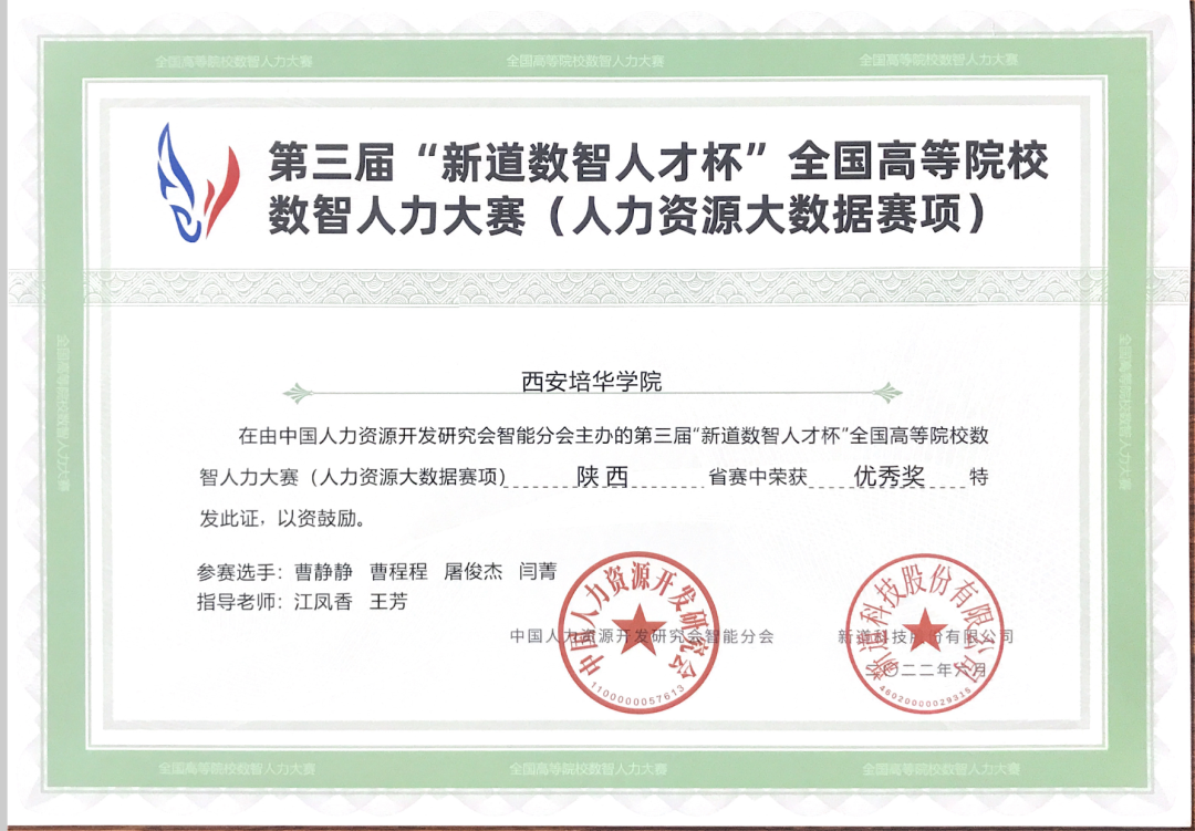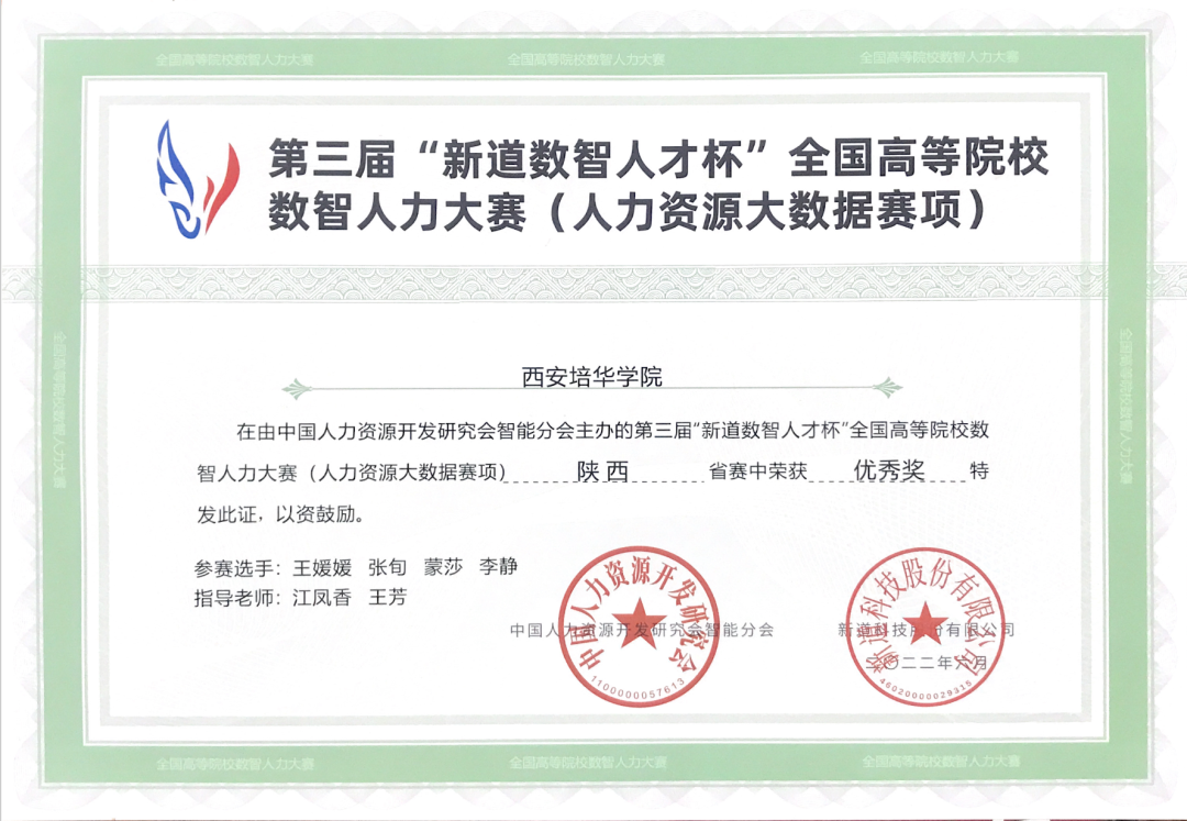 2022年6月24日,第三届“新道数智人才杯”全国高等院校数智人力大赛(人力资源大数据赛项)陕西省赛圆满落下帷幕。大赛由中国人力资源开发研究会智能分会主办,陕西师范大学、西安工业大学经济管理学院、杨凌职业技术学院协办、陕西省企业人力资源管理师协会支持,新道科技股份有限公司提供技术支持,大赛自6月13日启动,至6月24日结束,最终有16所院校、27支队伍顺利完成竞赛。