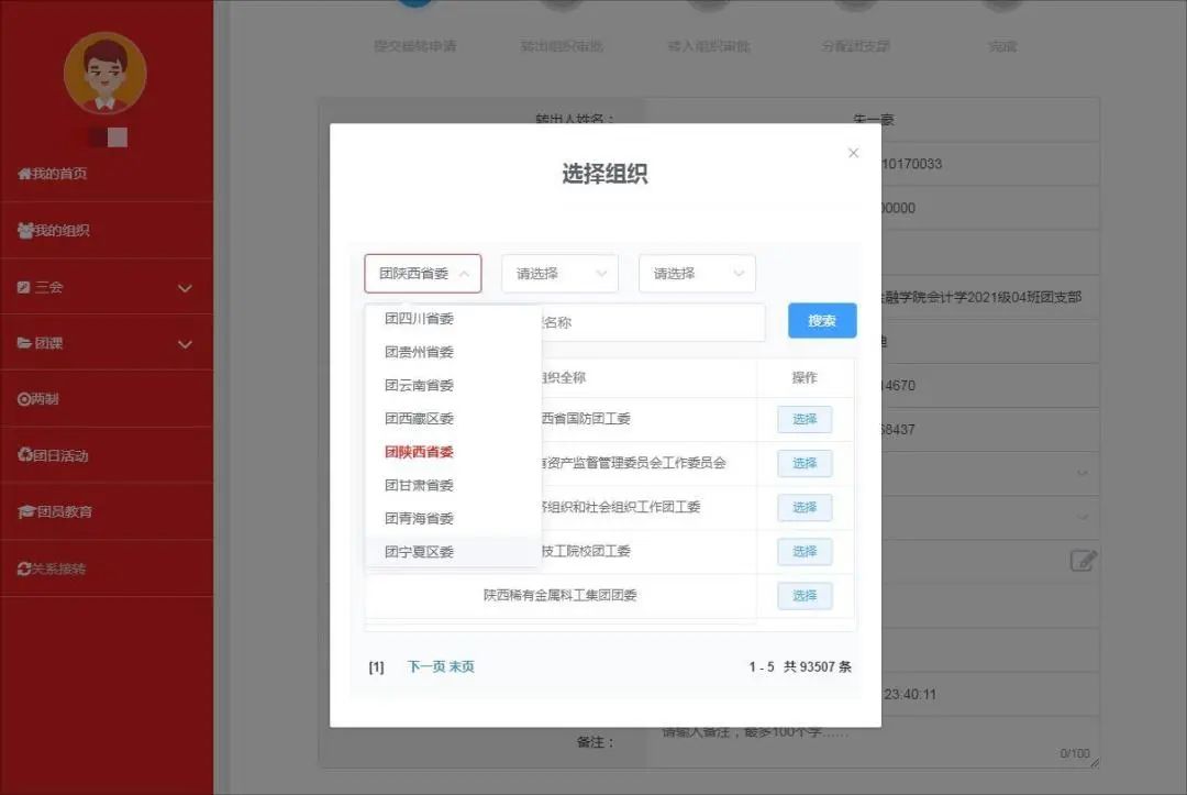 6、申请转入组织选择如下:团陕西省委——省教育团工委——西安培华学院团委