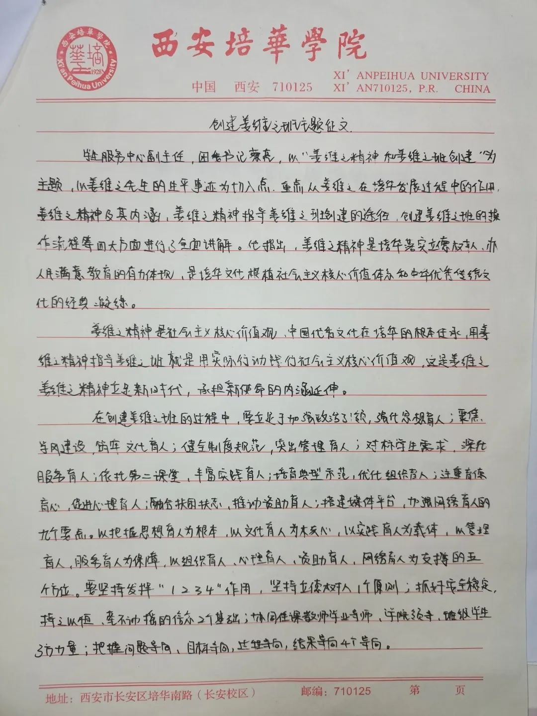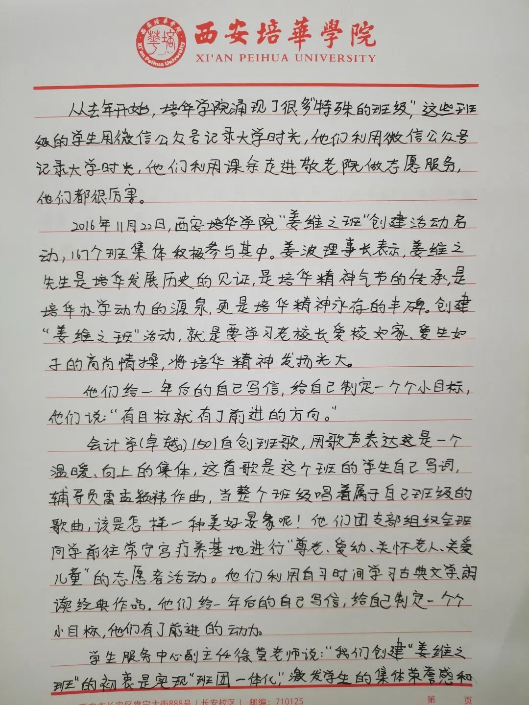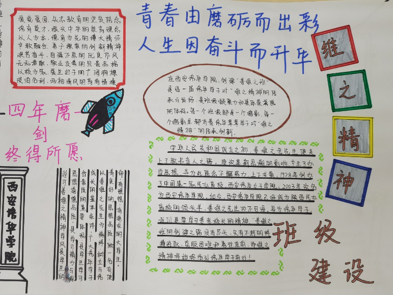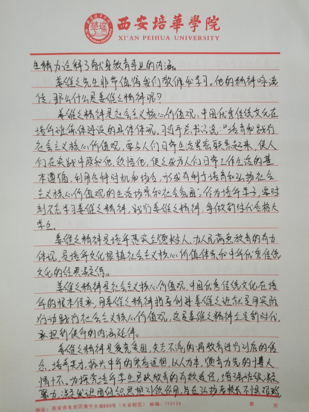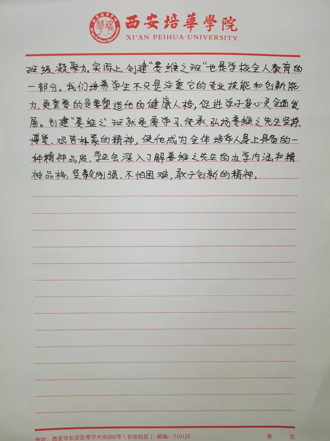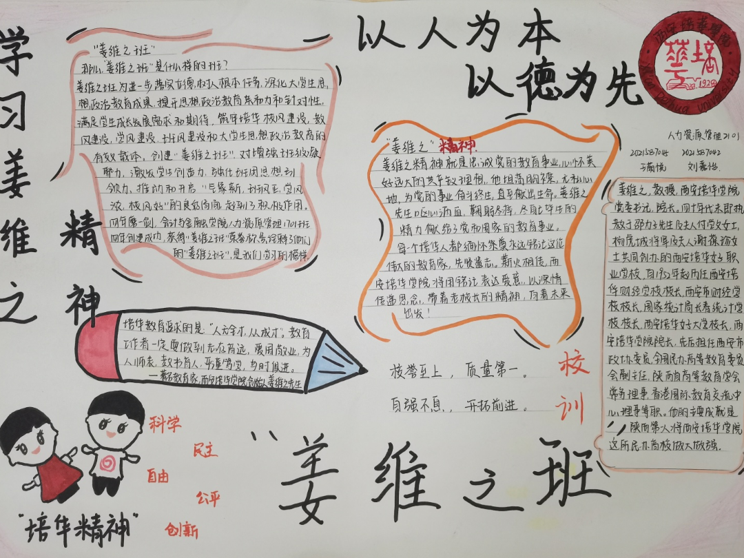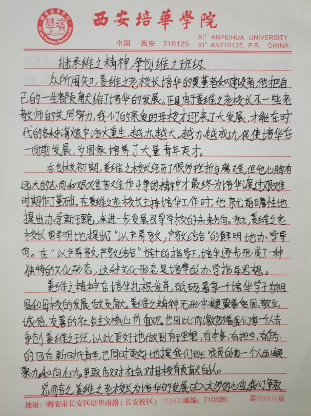我们要争做时代新青年,成为⼀个有理想,有毅⼒的培华学子,⼀个人要拥有坚定的理想,强大的毅力,同时有作为,敢担当,用科学的的力量,用文化的知识武装自己,早日成为⼀个建设祖国未来繁荣发展的优秀接班⼈。同时,建设“姜维之班”又是学校教育的一大特色,开展“姜维之班”的建设,主要目的便是希望各学院可以立足实际,统一思想,提高思想认知,特别是自“姜维之班”建设开展以来,学生们能够严格约束自己,学风建设,日常文明行为得到更⼀步的强化。培养了一大批坚毅刚强,不怕困难,敢与创新的优秀学子。