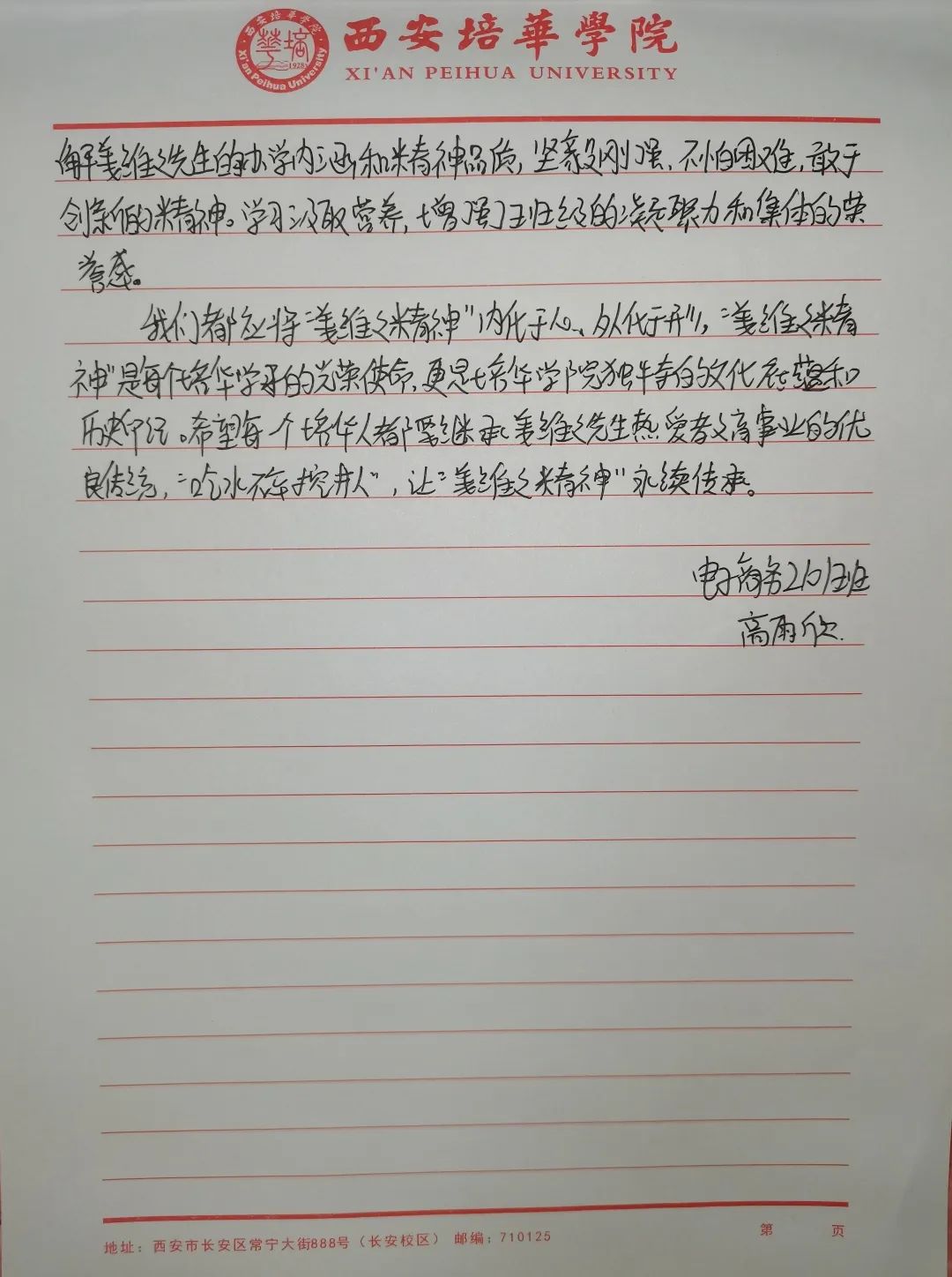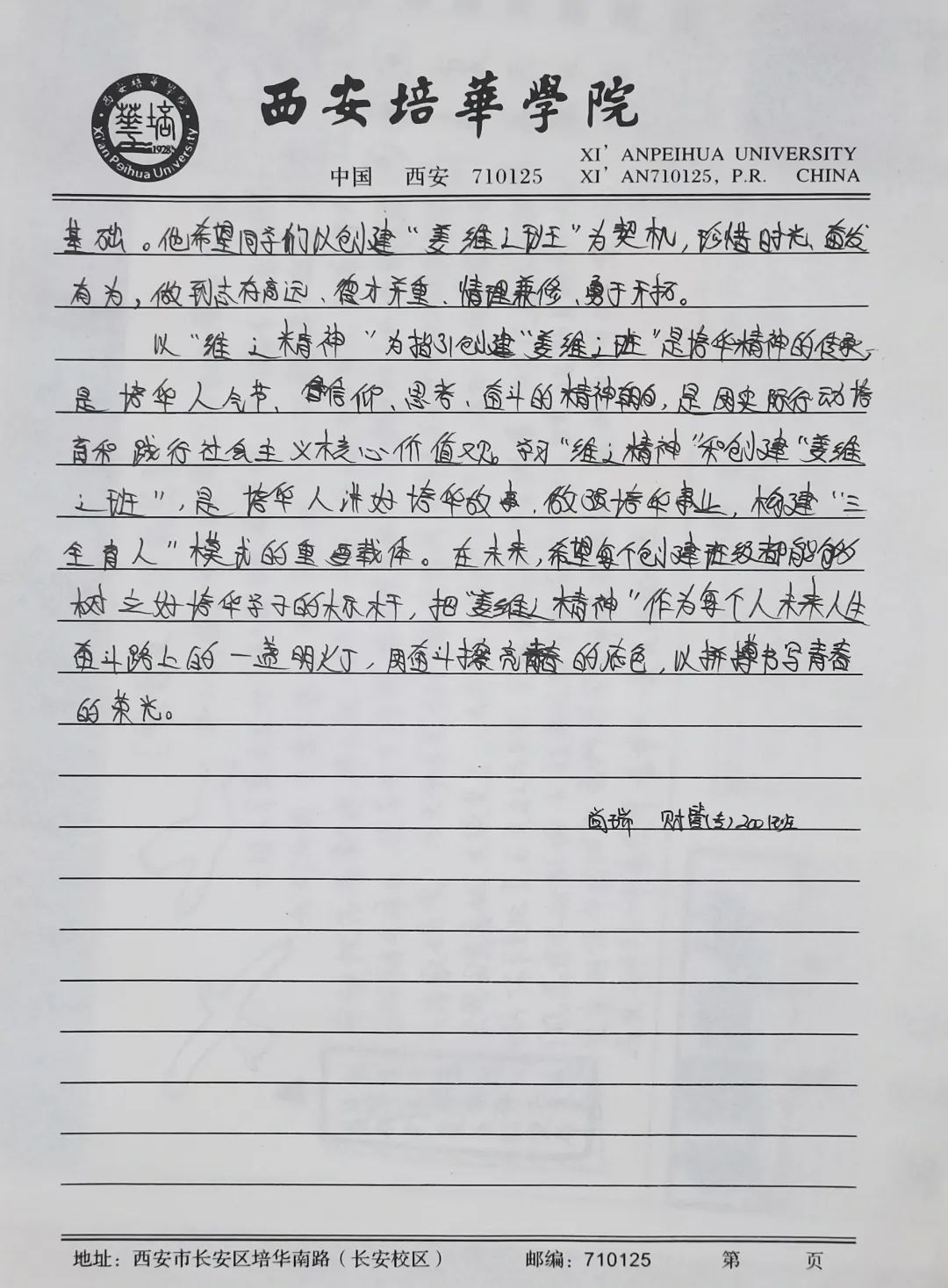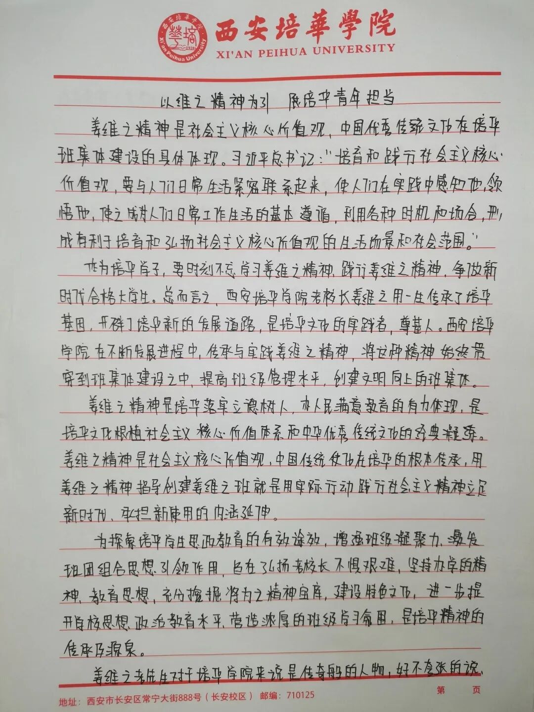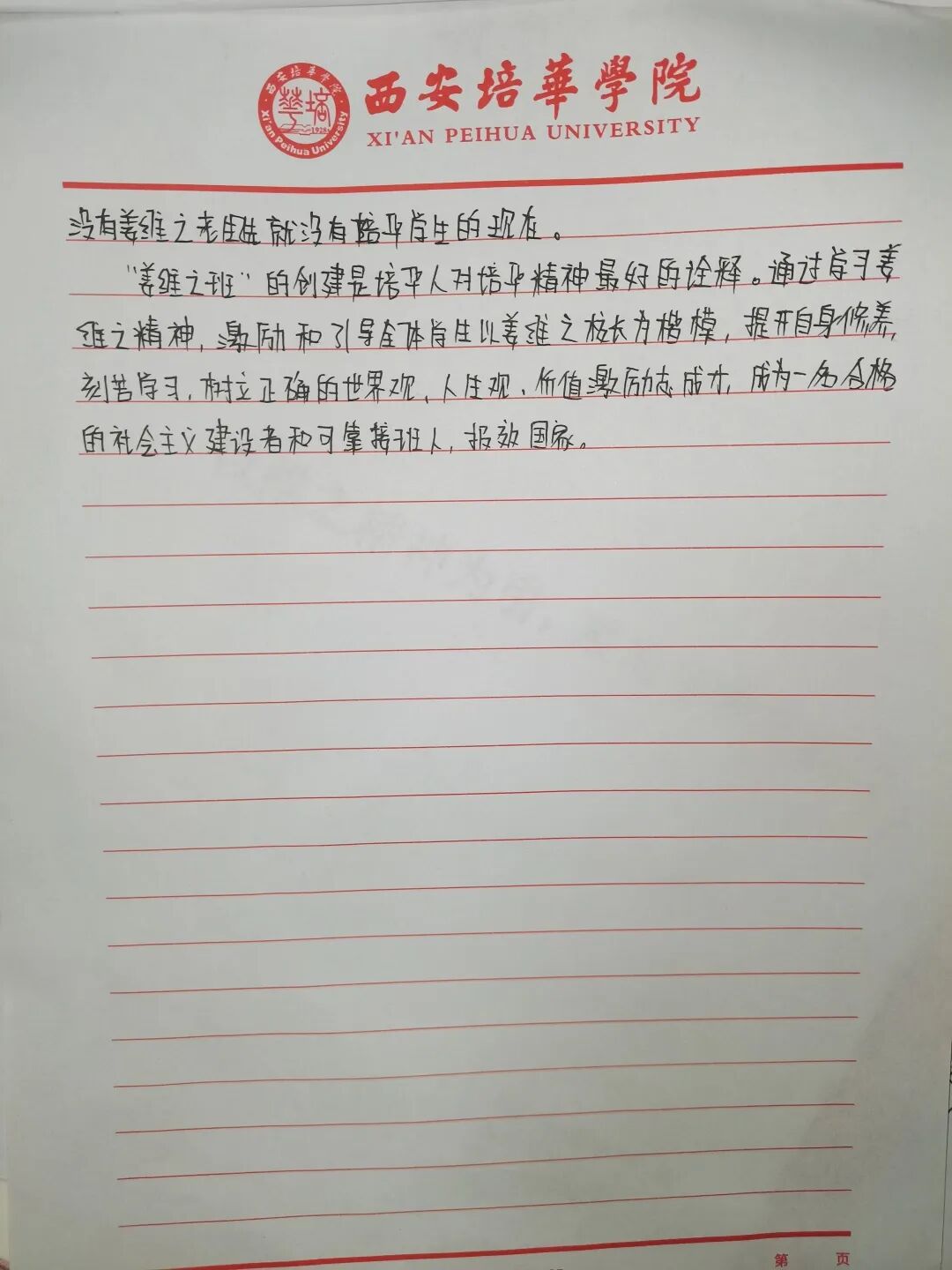 我们要争做时代新青年,成为⼀个有理想,有毅⼒的培华学子,⼀个人要拥有坚定的理想,强大的毅力,同时有作为,敢担当,用科学的的力量,用文化的知识武装自己,早日成为⼀个建设祖国未来繁荣发展的优秀接班⼈。同时,建设“姜维之班”又是学校教育的一大特色,开展“姜维之班”的建设,主要目的便是希望各学院可以立足实际,统一思想,提高思想认知,特别是自“姜维之班”建设开展以来,学生们能够严格约束自己,学风建设,日常文明行为得到更⼀步的强化。培养了一大批坚毅刚强,不怕困难,敢与创新的优秀学子。