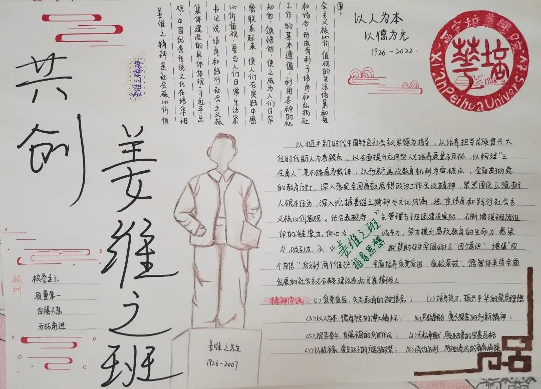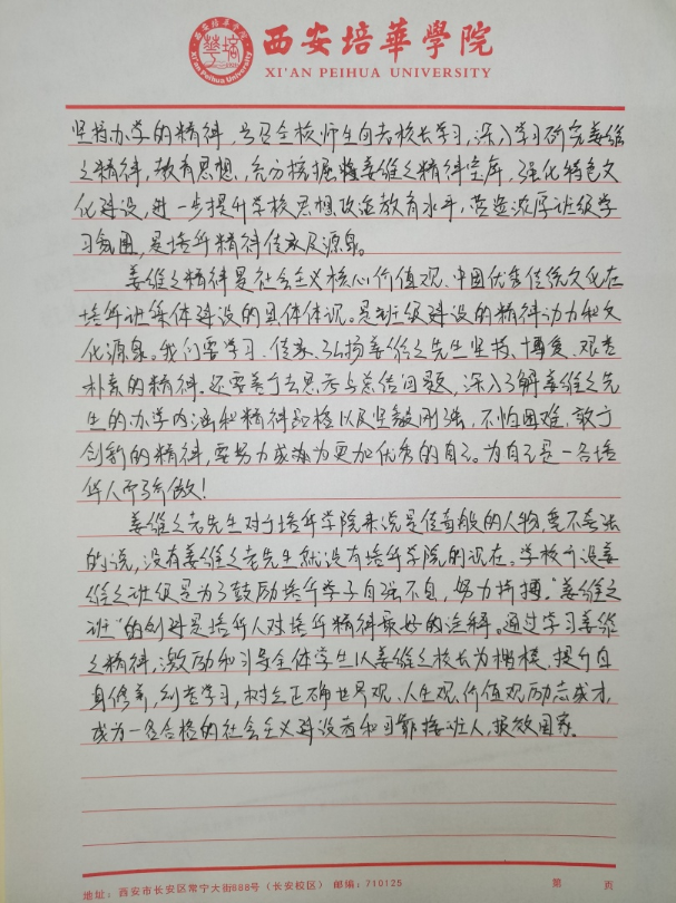 会计与⾦融学院的学子们也秉承这一点。姜维之院长凭着对学子们慈父般的挚爱,凭着对培华学院深厚的情感,也凭着创业者的满腔热血,率领培华学院走出了⼀条“以教带企,以企养教,产教结合,同步发展” 的成功办学之路。学习“姜维之精神”和创建“姜维之班”,是培华人讲好培华故事、做强培华事业,构建“三全育人”模式的重要载体;用“姜维之精神”指导创建“姜维之班”是培华精神的传承,诗配画人的气节、信仰、思考、奋斗之精神朝向。