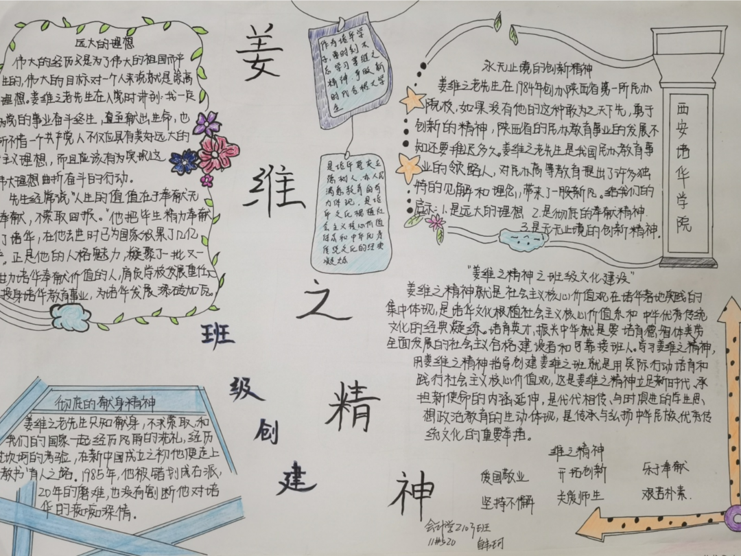 为充分践行“姜维之精神”,会计与金融学院开展了争创“姜维之班”系列主题征文和⼿抄报,,同学们积极参与进来,用实际行动践行社会主义核心价值观。我院将“姜维之精神”立足于新时代,传播于学子们的身边,滋润培华千千的学子们。