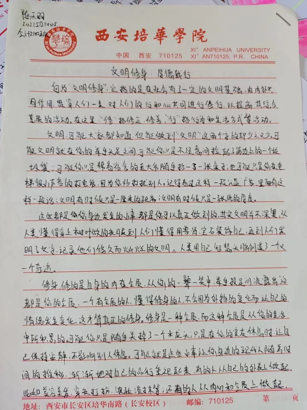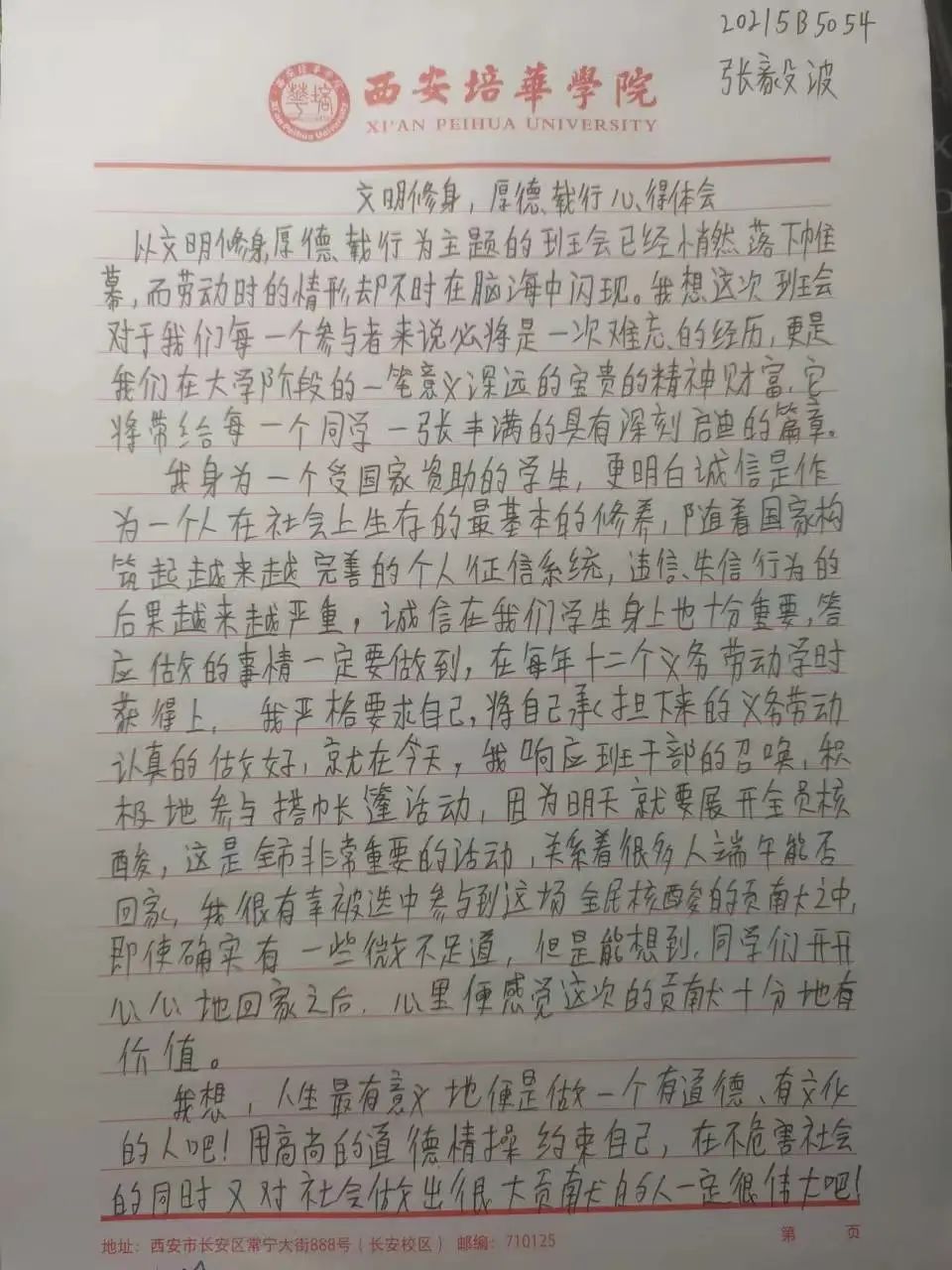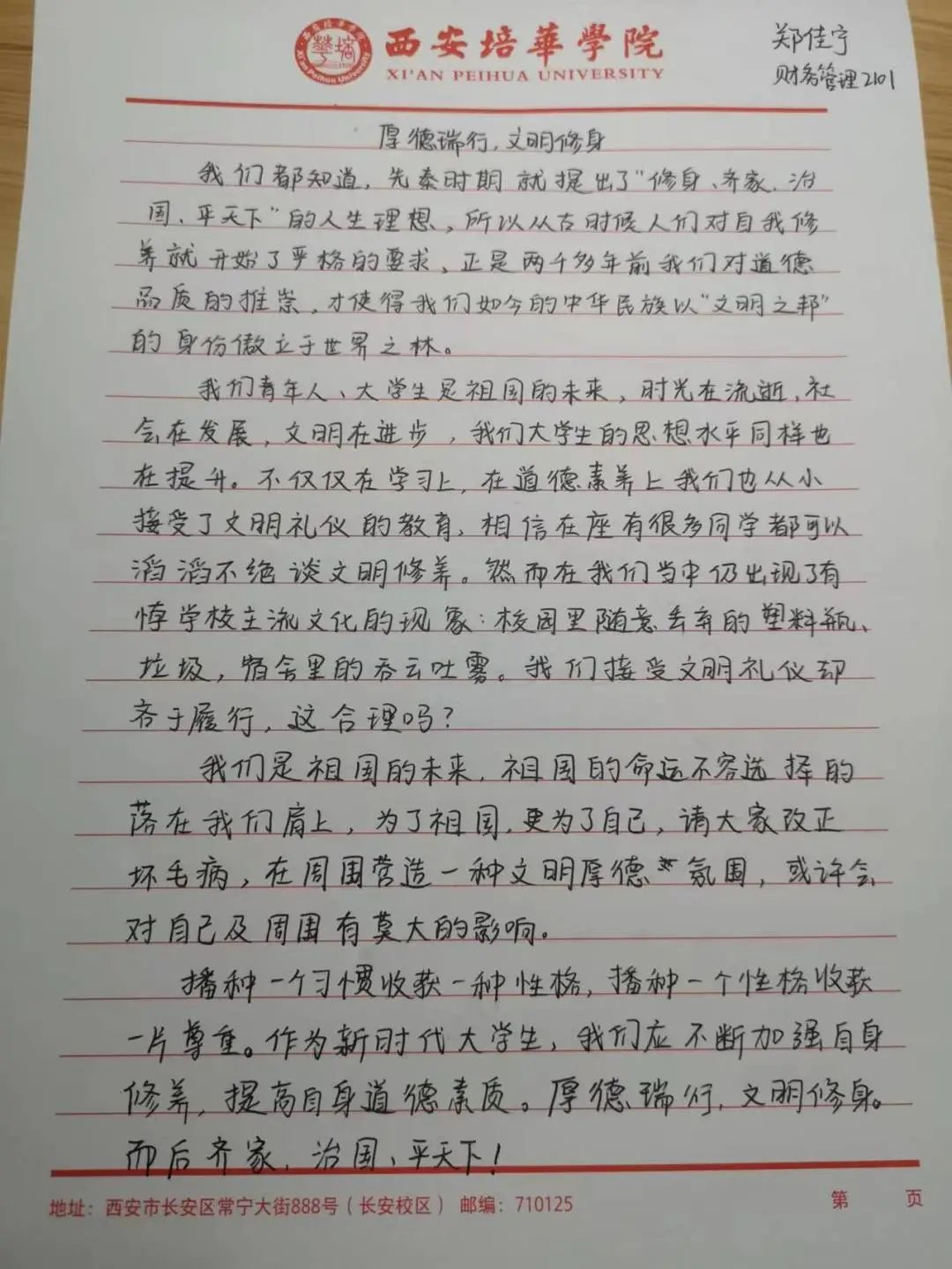 中华民族素来是谦恭礼让的文明礼仪之邦。中华文化博大精深,源远流长。以人为本,以德为先,以人为本,是胡锦涛同志提出的科学发展观的核心,体现了中国共产党全心全意“为人民服务”的根本宗旨。道德是立人之本,有才无德的人便是一个可怕之人,德是做人做事的根本原则,是人们安身于世上最重要的基石。从小的教育让我们知道尊老爱幼,勤俭节约,尊师重道。三人行,必有我师焉,择其善者而从之,其不善者而改之。由此可见修身立德非常重要,作为大学生的我们,要坚定自己的理想信念,以道德准则严格要求自己,树立正确的道德观,以人为本,以德立人。