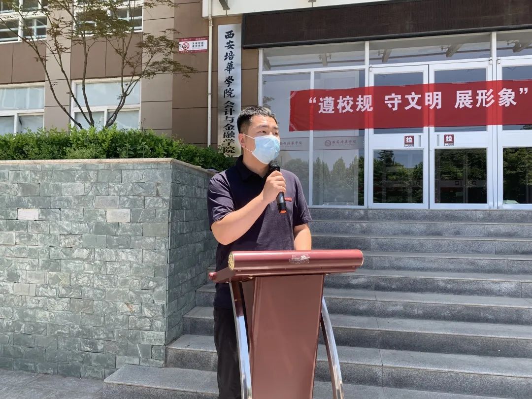 为切实加强疫情防控常态化背景下学生教育管理工作,进一步教育引导学生坚定理想信念、涵养崇高品德,提振精神面貌、践行文明行为、优化校园环境,促进学生良好生活习惯的养成,加强学生精神文明建设,营造良好的自我管理与自我教育的浓厚氛围和良好风气,会计与金融学院于2022年6月16日12:00在博远楼西广场举办“遵校规守文明展形象做文明大学生”主题活动。本次活动由会计与金融学院党委副书记韩斌主持,与会人员有大一大二年级的辅导员、班长和团支书。