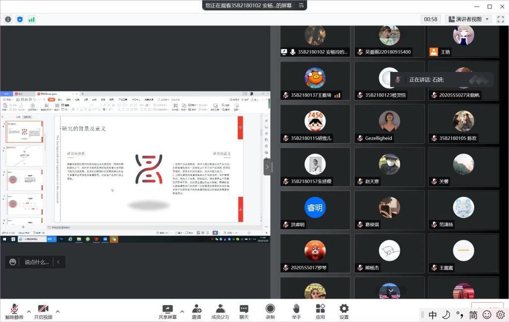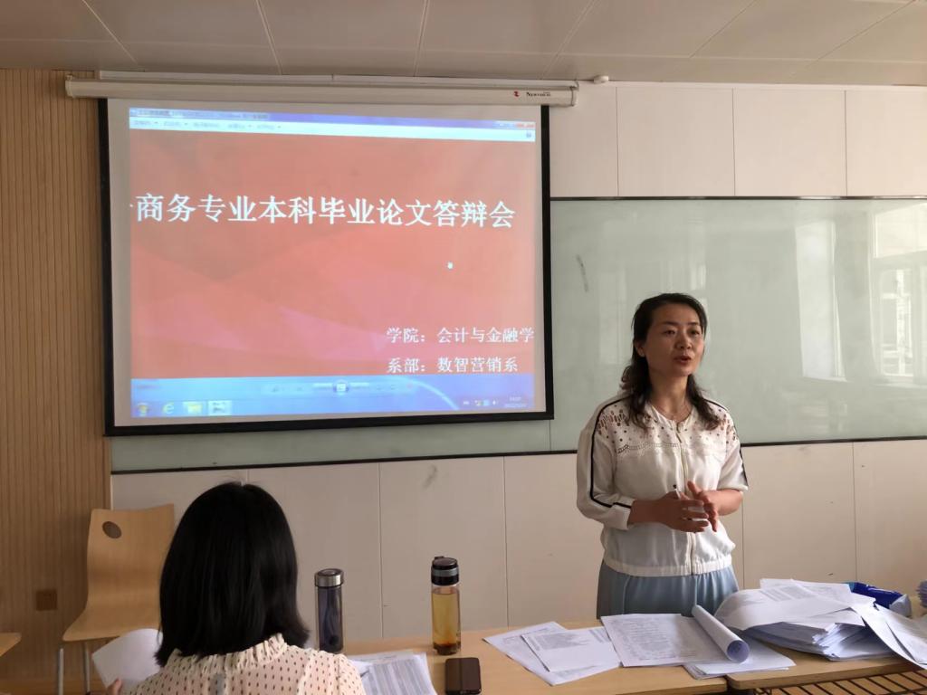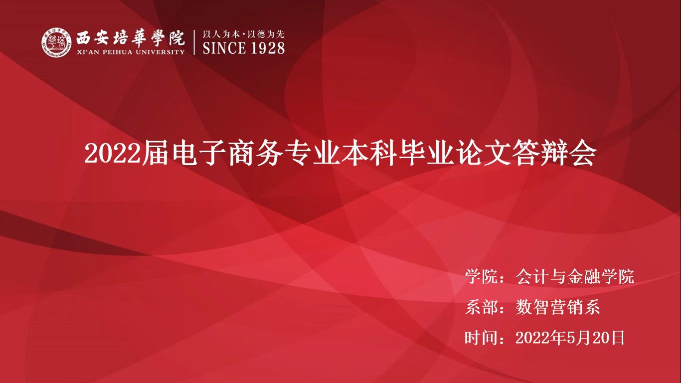 根据《西安培华学院本科毕业论文(设计)答辩工作实施细则(修订)》(培华院教发2020【71号】)文件要求,本着进一步优化毕业答辩组织程序,提高论文质量的要求,会计与金融学院电子商务专业在2022年5月20日14:00分别在博远楼2415、2416、2417举办了2022届本科毕业生论文答辩会。本次答辩设答辩组长3人,答辩秘书3名,参与中高职称教师共计9人,学生共计92人,其中参与线上答辩19人。