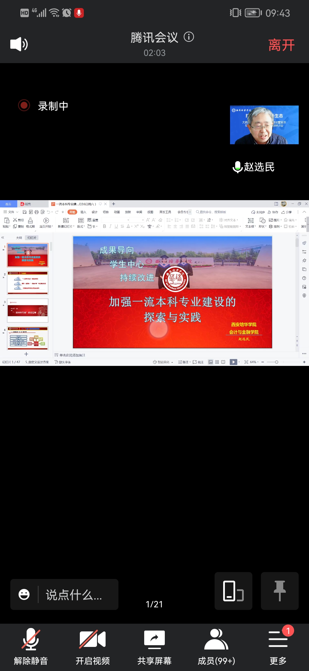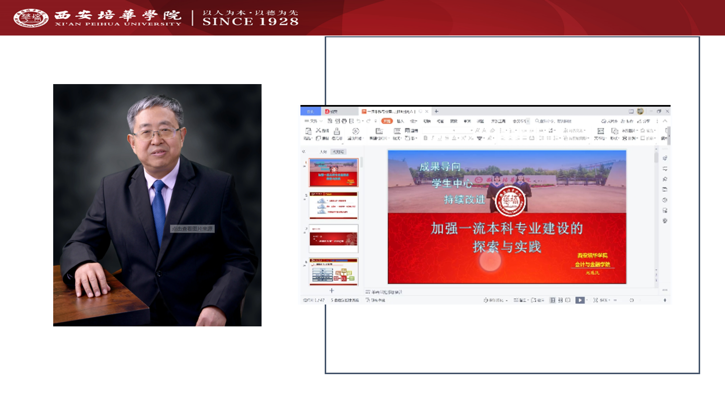 会计与金融学院院长赵选民教授分享了《加强一流会计本科专业建设的探索与实践》,赵院长从西安培华学院王牌专业——会计学专业的发展状况谈起,介绍了会计学始建于1928年商科,历经高级会计科、会计学本科、获得学士学位授权、省级特色专业、省级重点扶持专业、省级综合改革试点专业、省级精品课程、省级一流专业,最终成为国家级一流专业的发展历程,其中有艰辛有喜悦,有探索有成绩,今日的会计学专业要继续保持一流必须适时转型,为培养数智时代复合型管理会计创新人才贡献培华方案。