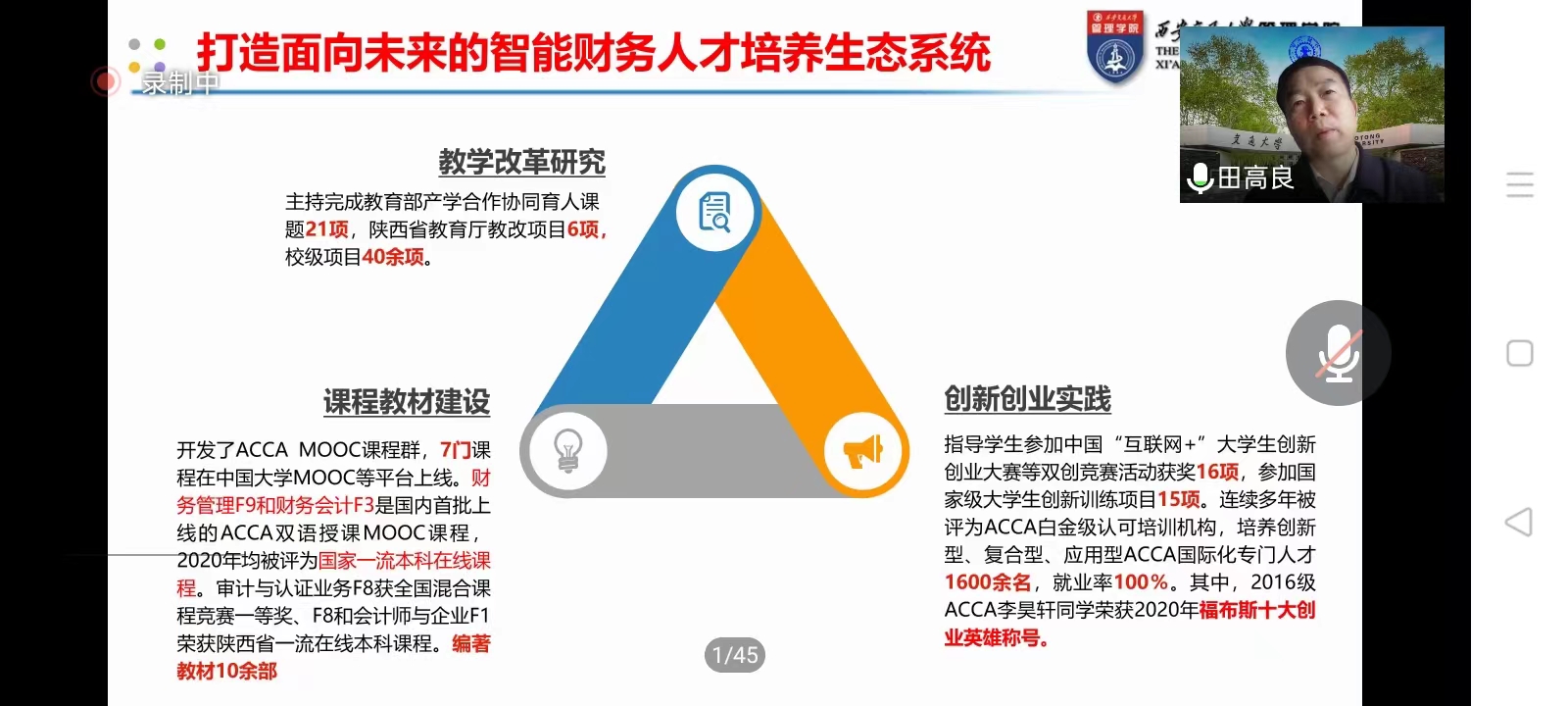 会议首先由主嘉宾西安交通大学博士生导师、管理学院副院长田高良教授主讲《数智时代复合型管理会计创新人才培养探究》,田教授是教育部会计学专业教指委委员、财政部管理会计咨询专家、陕西省工商管理类教指委主任委员、全国会计学术类领军人才,他分享的打造面向未来的智能财务人才培养生态系统令听者思路顿开、受益匪浅,田教授指出,从科技、专业、生态、机制四个维度赋能产教融合,打造多主体协同育人的长效机制,构建产教融合、校企合作的良好生态,形成良性循环的机制:政府搭台、企业支持、高校对接、共建共享,这样能够有效激发各方的积极性和创新活力,有力推动高校人才培养模式变革,为培育一批创新型、复合型、应用型高素质的国际化智能财务人才搭建平台。
