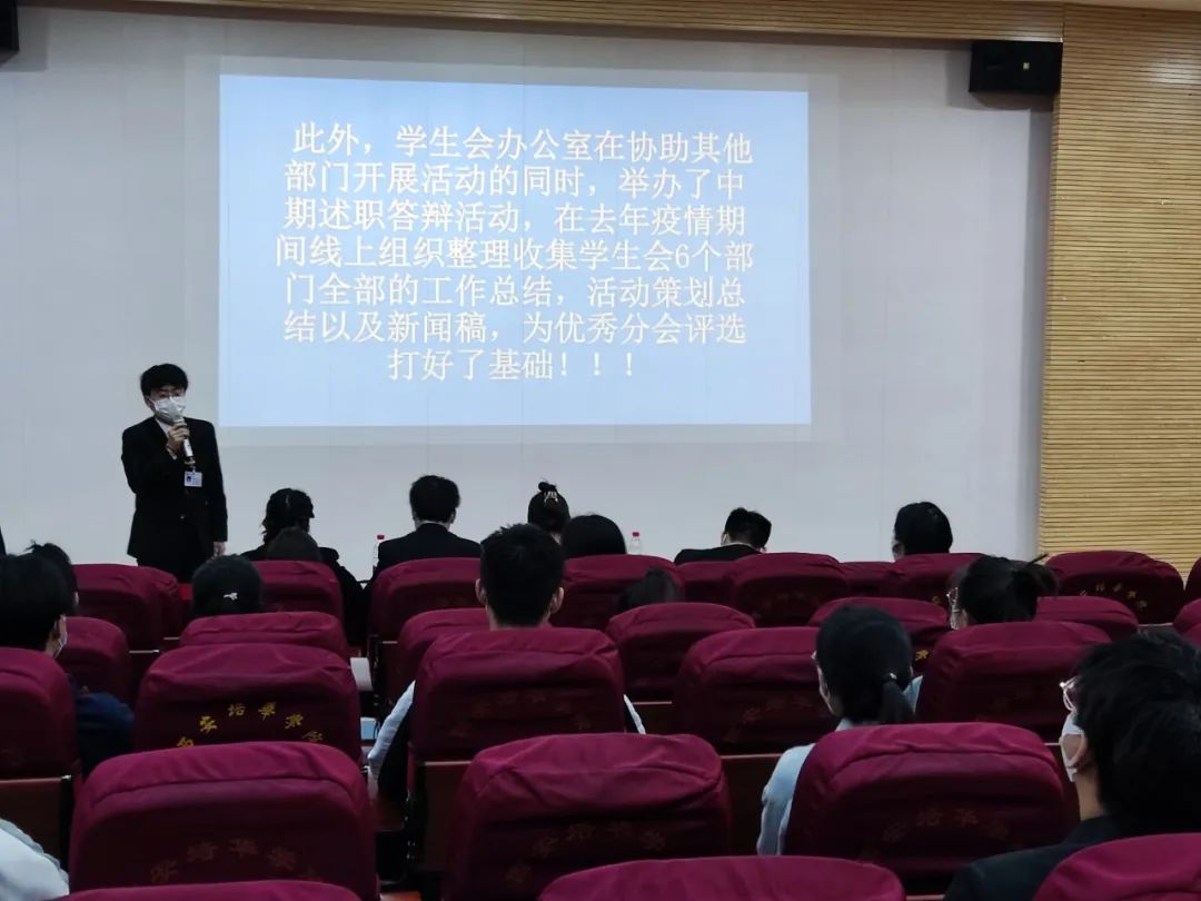 接着由各部门负责人发言,各部门负责人以PPT的形式对上一学期的活动展示、工作得失情况等做以总结;同时,对本学期工作计划和安排、未来展望等情况作出概述,并结合自身部门特点,向在场学生会成员传授了宝贵的工作经验。