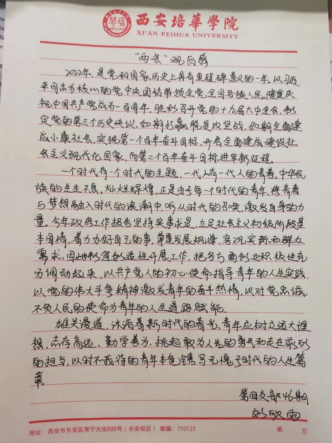 十年全国两会,十个春天的故事。这是思想之光照耀奋进之路。在2022年全国两会举行时,西安培华学院会计与金融学院秉承着伟大思想源自伟大时代,新的理论指导新的实践。以求学问道之心组织党委各支部进行两会观看学习与理解总结。疫情影响下,各个支部也于线上就两会内容进行学习与探讨。各支部同学提交反馈积极更显现出同学们“万山磅礴看主峰,沧海茫茫望灯塔”学习新思想,追随党和国家的爱国情谊。三月的中华大地春和景明,万物复苏。数千名全国人大代表、全国政协委员肩负人民重托和神圣使命齐聚北京,广谋良策、广聚共识、共商大计。在全面建设社会主义现代化国家新的道路上,今年全国两会必将谱写出民主、团结、求实、奋进的崭新篇章,激励亿万人民乘势而上,砥砺前行,向着第二个百年奋斗目标不断迈出坚实步伐。